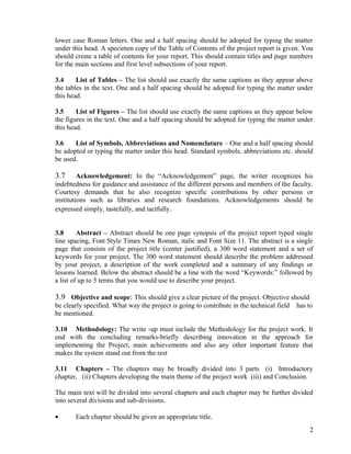 It specifies the font, spacing, and formatting for each section, and provides examples of content for sections like the abstract, objectives, methodology, conclusions. Overall, the guidelines aim to standardize the structure, formatting, and presentation of information in project reports.