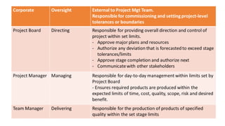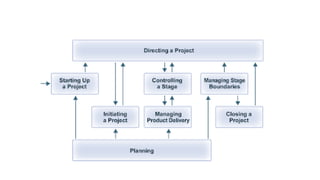 The document outlines guidelines for managing projects using the PRINCE2 model, highlighting the importance of standardized terminology and the roles and responsibilities involved in project management. It details the processes for starting, initiating, directing, and controlling projects, as well as emphasizes the necessity of aligning plans with the business case. Additionally, the document identifies potential gaps in current project practices when compared to the PRINCE2 framework.