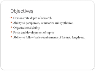This document provides guidelines for students writing a research paper. It outlines objectives like demonstrating in-depth research through paraphrasing, summarizing, and synthesizing sources. Students should write a paper that is at least 2000 words, includes a title and name, is double-spaced, contains proper in-text citations, and integrates quotes into their own writing. The document recommends using paraphrase and summary more than direct quotes. It also provides formatting guidelines like including a works cited list and avoiding things like title pages or excessive direct quotes.