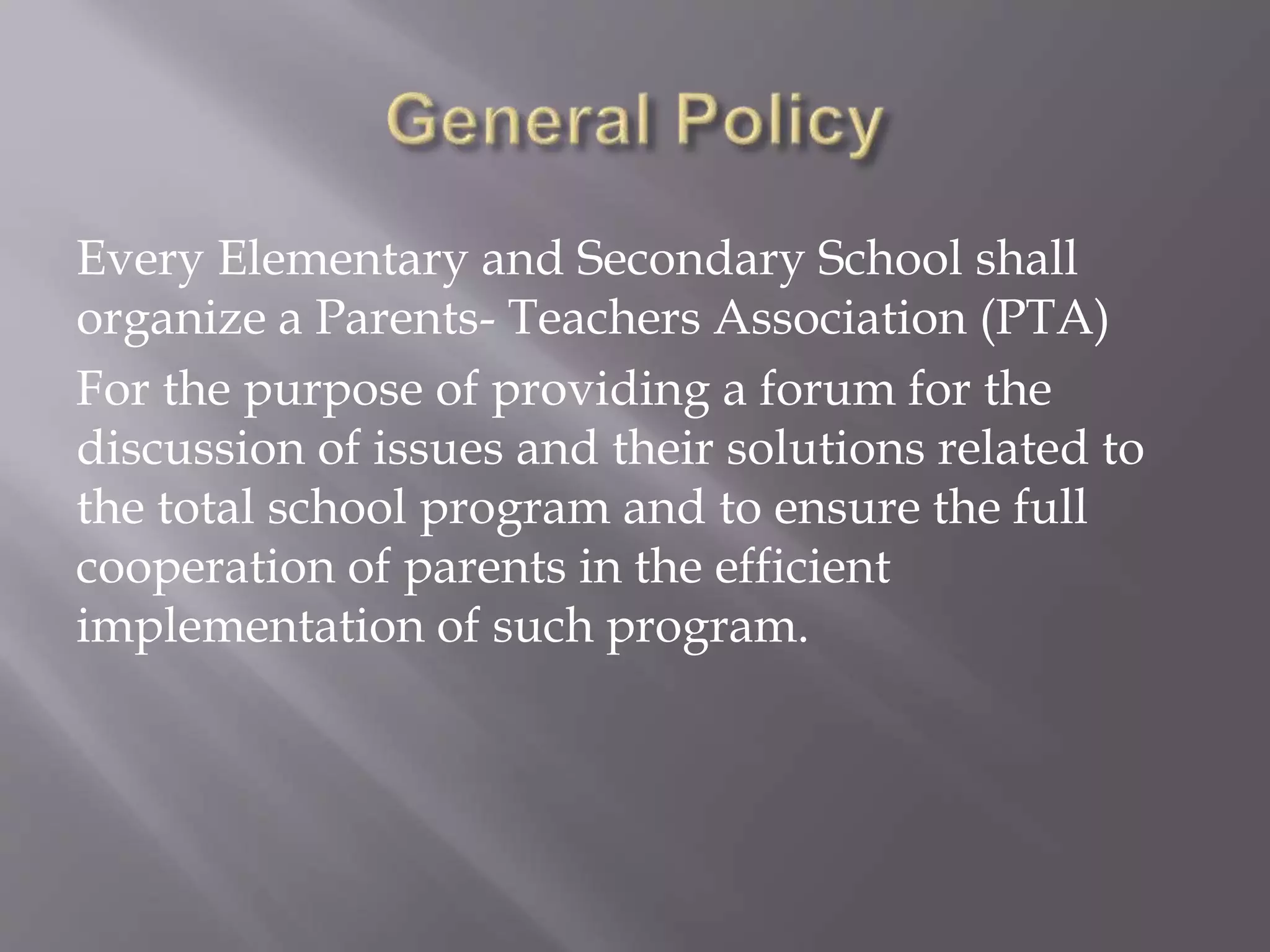 This document outlines the guidelines for establishing and organizing Parent-Teacher Associations (PTAs) in elementary and secondary schools. It states that every school must organize a PTA to provide a forum for discussing school issues and ensuring parental cooperation. The PTA will serve as a support group for the school and coordinate with community members, teachers, and parents. Membership is limited to parents/guardians of enrolled students and school teachers. Elections will be held to select the PTA board of directors and officers.