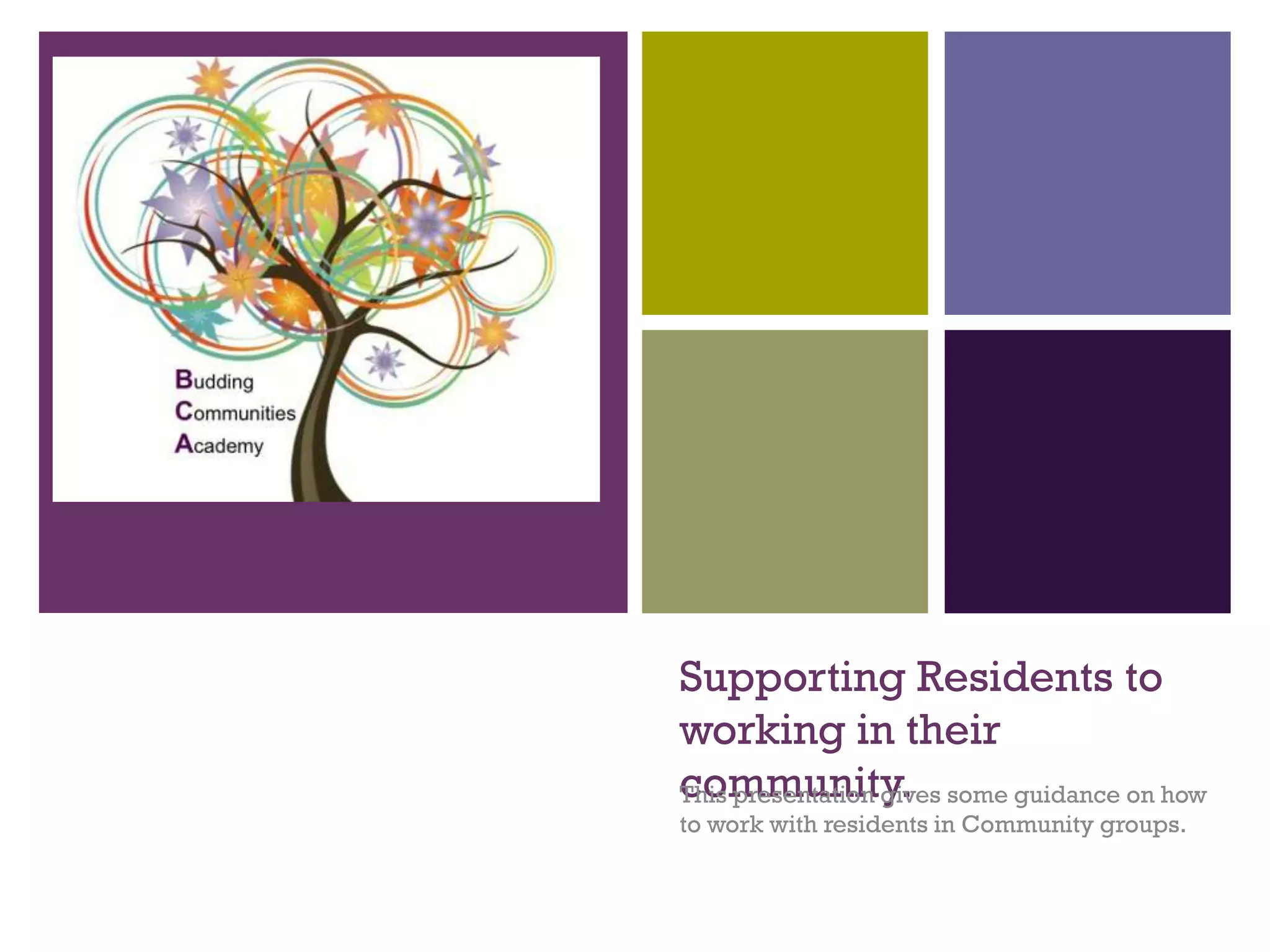 This document provides guidance for supporting residents who work within their own communities. It discusses the need for induction training to outline roles, responsibilities, and expectations. It also emphasizes establishing guidelines around maintaining confidentiality, managing potential conflicts of interest or divided loyalties, and setting appropriate boundaries between work and personal life. The goal is to empower residents through community involvement while protecting unpaid workers and fostering balanced representation.