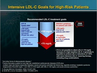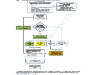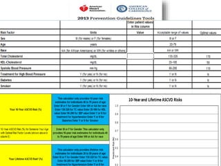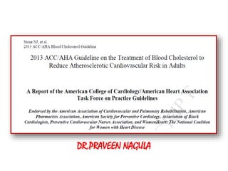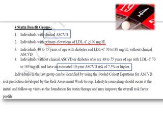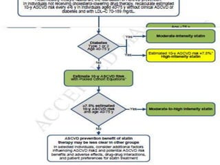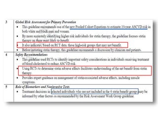The document summarizes the 2013 ACC/AHA blood cholesterol treatment guidelines. The guidelines aim to reduce atherosclerotic cardiovascular disease risk based on evidence from statin randomized controlled trials. The guidelines recommend a patient-centered approach and emphasize that high- and moderate-intensity statin therapy provides the greatest reduction in risk across all baseline LDL-C levels. Primary prevention recommendations are based on estimated 10-year cardiovascular risk. The guidelines do not recommend targeting specific LDL-C levels but rather emphasize intensity of statin therapy.
