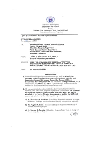This document contains templates for approval sheets and letters requesting permission to write, implement, and submit the final paper for a module, strategic intervention material, instructional material, innovative project, income generating project, or community-based project in the Schools Division Office of Pangasinan II in the Philippines. The templates provide the required format and approvals from education supervisors, the Schools Division Superintendent, and Assistant Schools Division Superintendents.