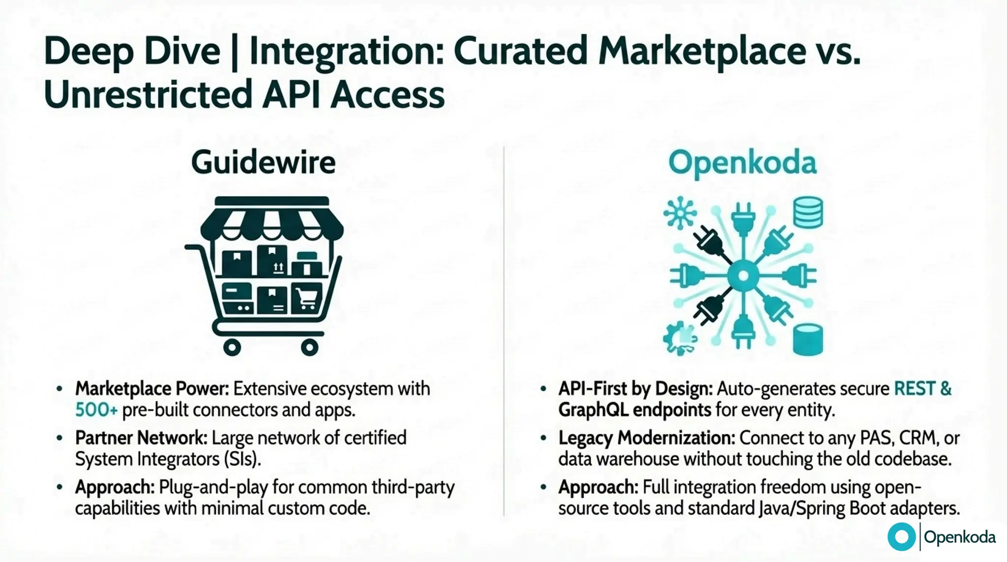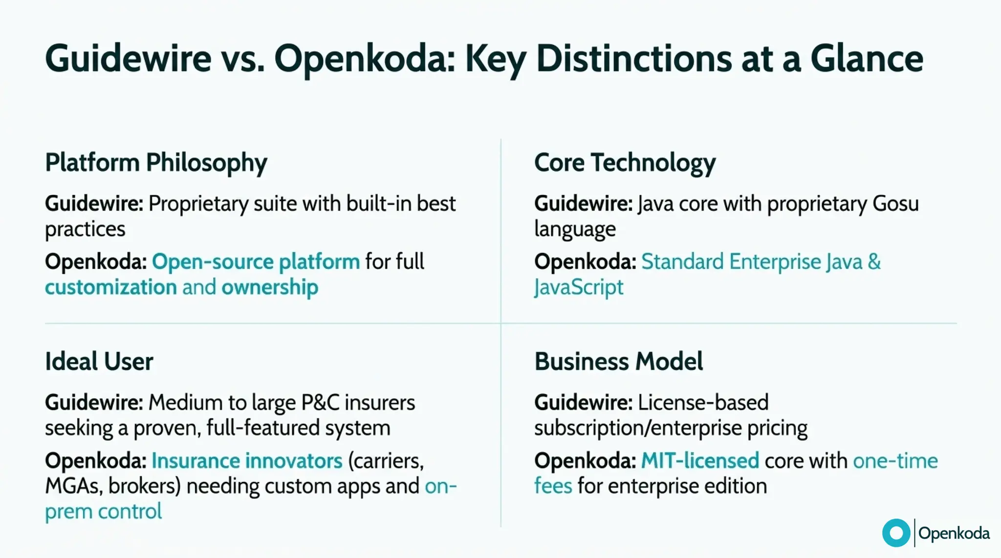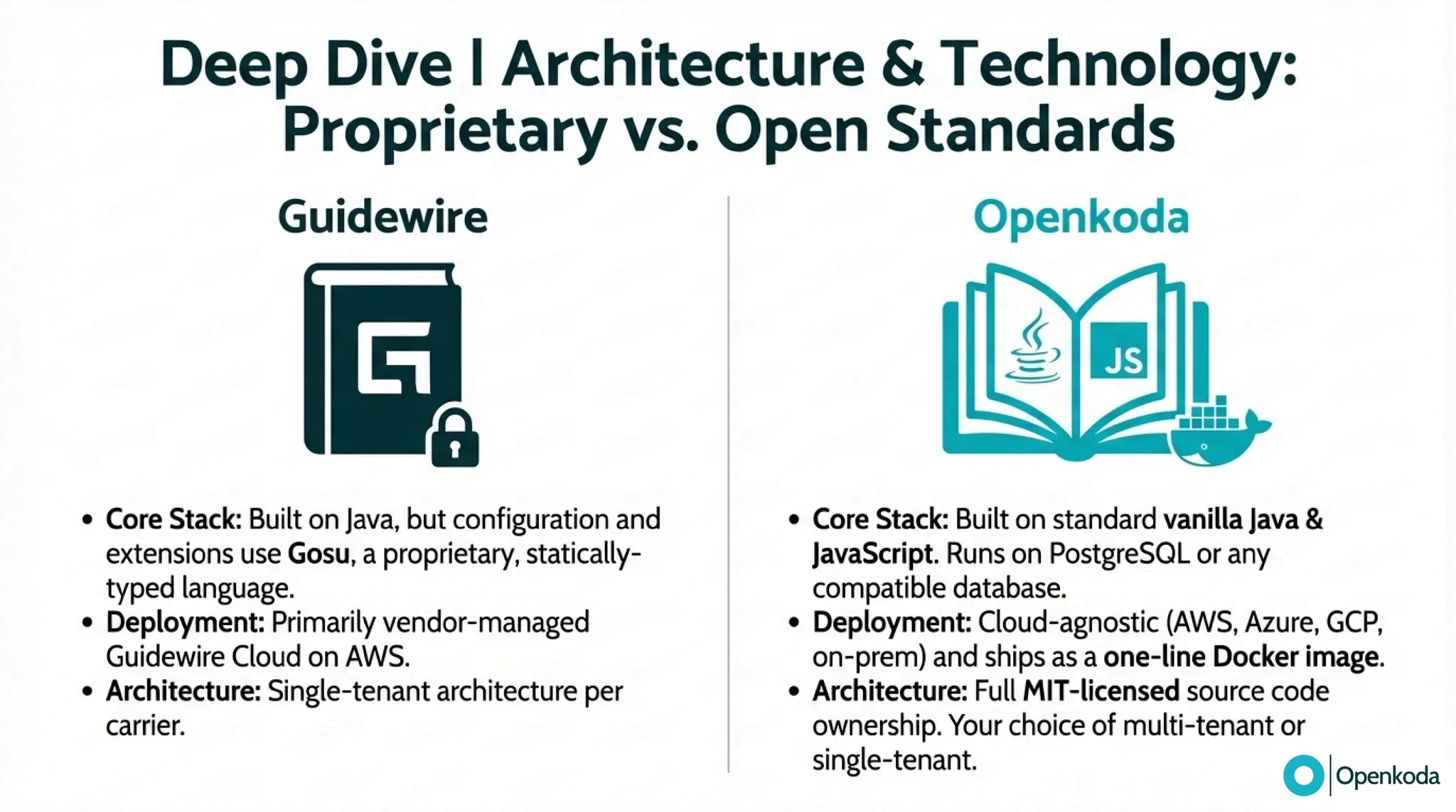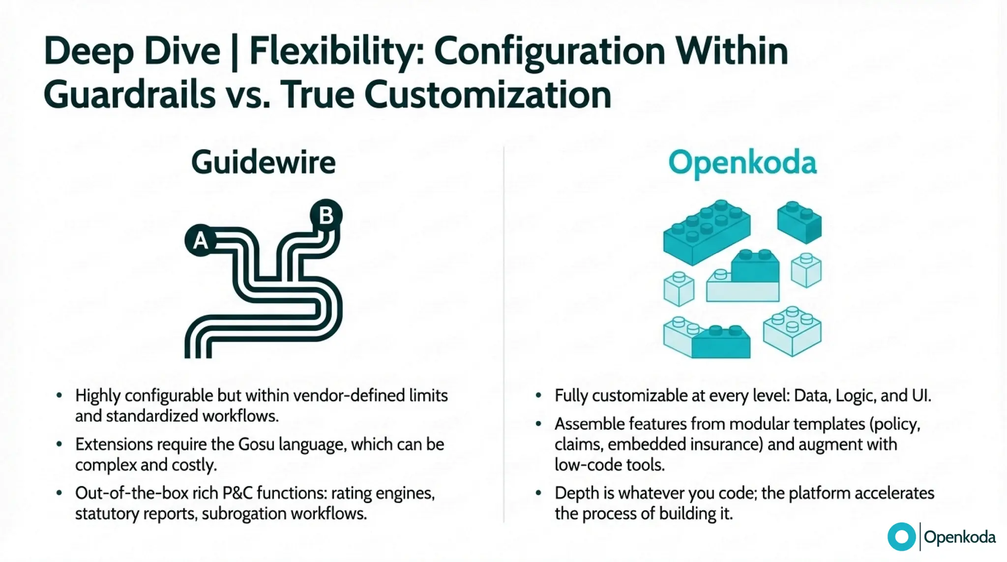 Break down the real trade-off between Guidewire’s integrated, proprietary suite and Openkoda’s open-source “canvas” for building exactly what your business needs. If you’re fed up with vendor lock-in, proprietary tooling (and the cost/complexity that comes with it), and a vendor-managed roadmap that makes every change feel heavier than it should, discover a more refreshing alternative built on open standards. See how Openkoda gives you full code ownership, cloud-agnostic deployment, API-first integration, and modular insurance building blocks - so you can modernize faster and evolve on your terms.