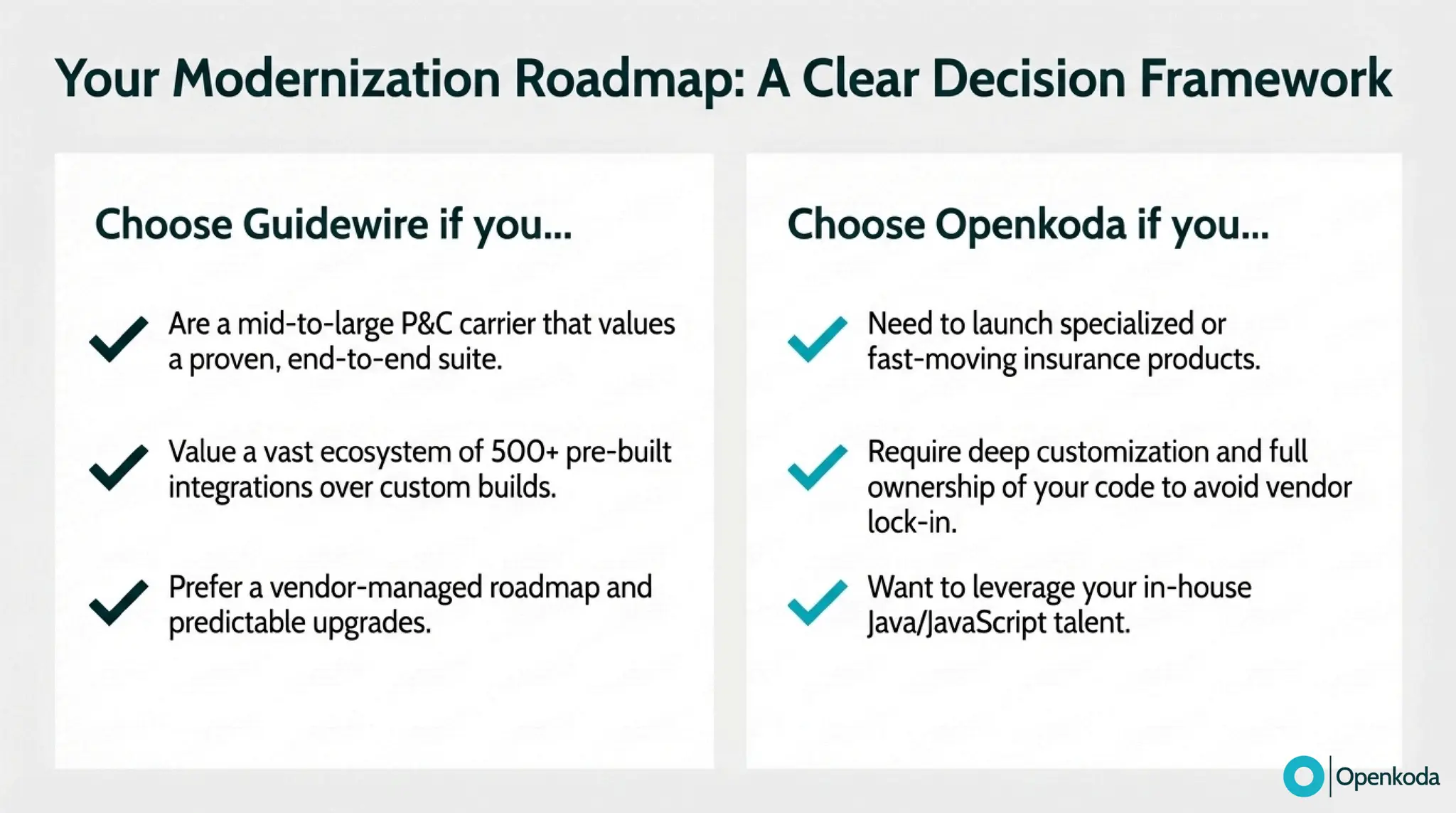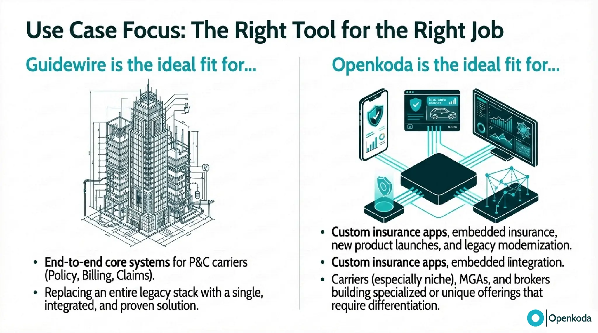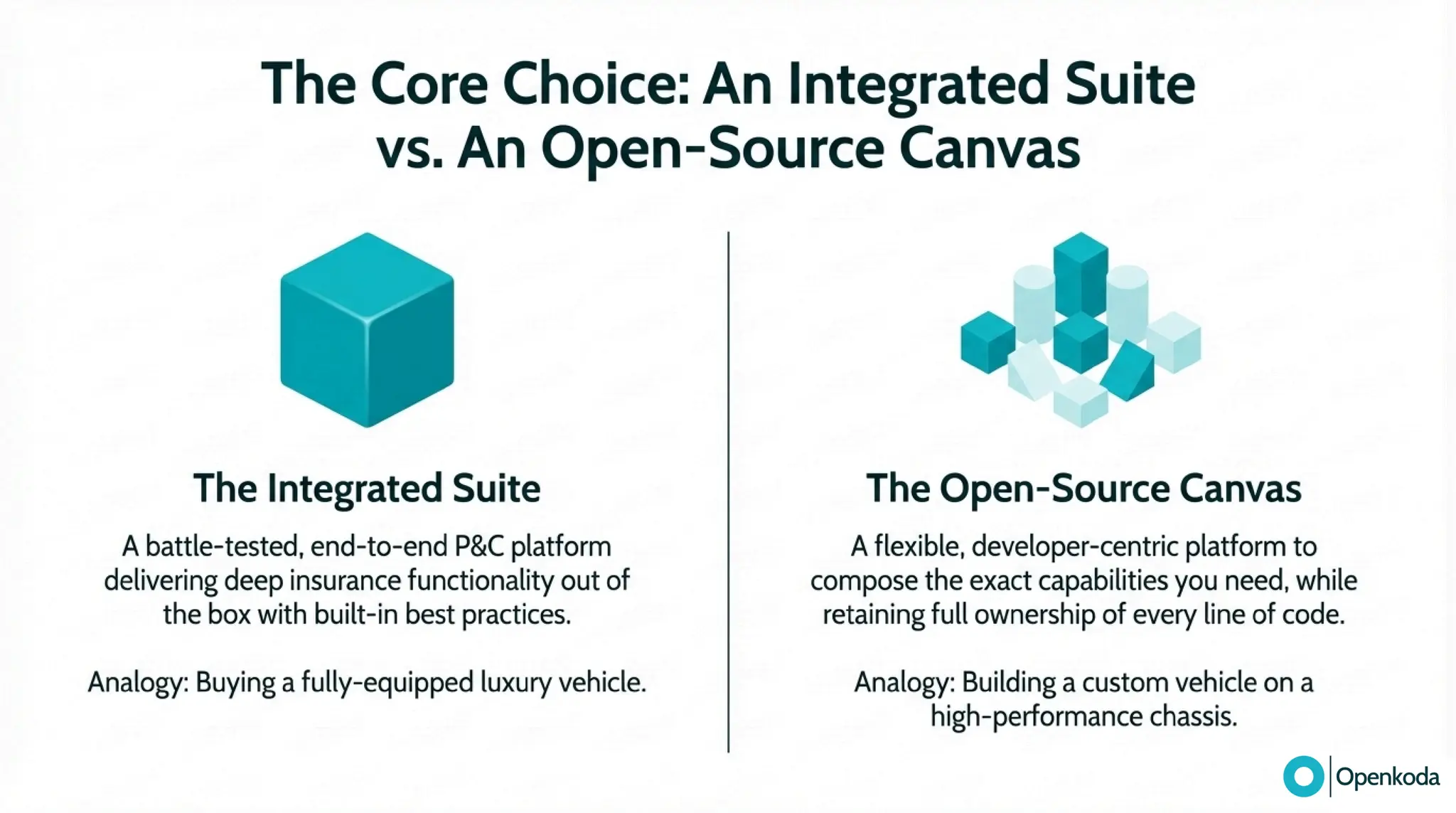 Break down the real trade-off between Guidewire’s integrated, proprietary suite and Openkoda’s open-source “canvas” for building exactly what your business needs. If you’re fed up with vendor lock-in, proprietary tooling (and the cost/complexity that comes with it), and a vendor-managed roadmap that makes every change feel heavier than it should, discover a more refreshing alternative built on open standards. See how Openkoda gives you full code ownership, cloud-agnostic deployment, API-first integration, and modular insurance building blocks - so you can modernize faster and evolve on your terms.