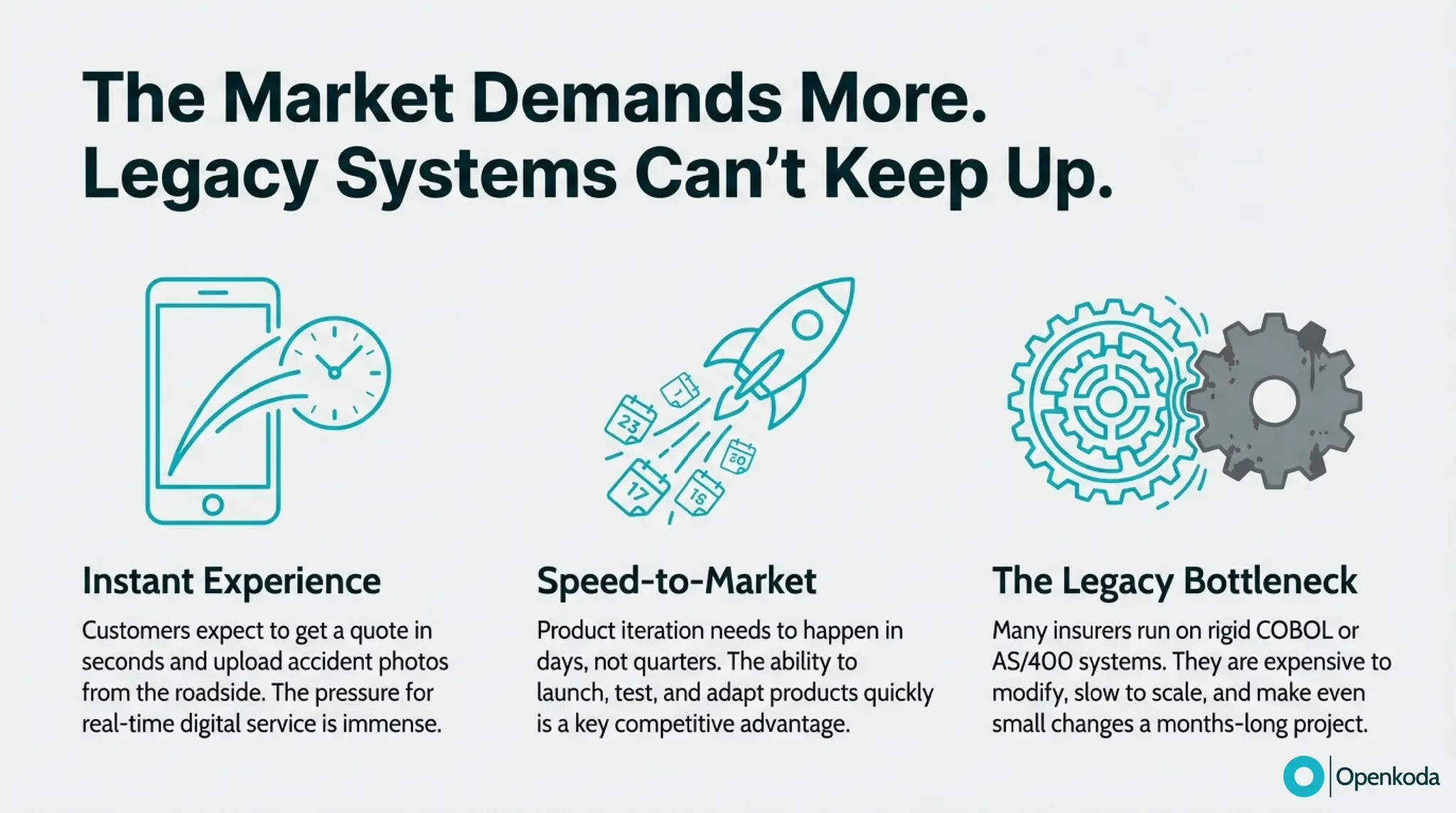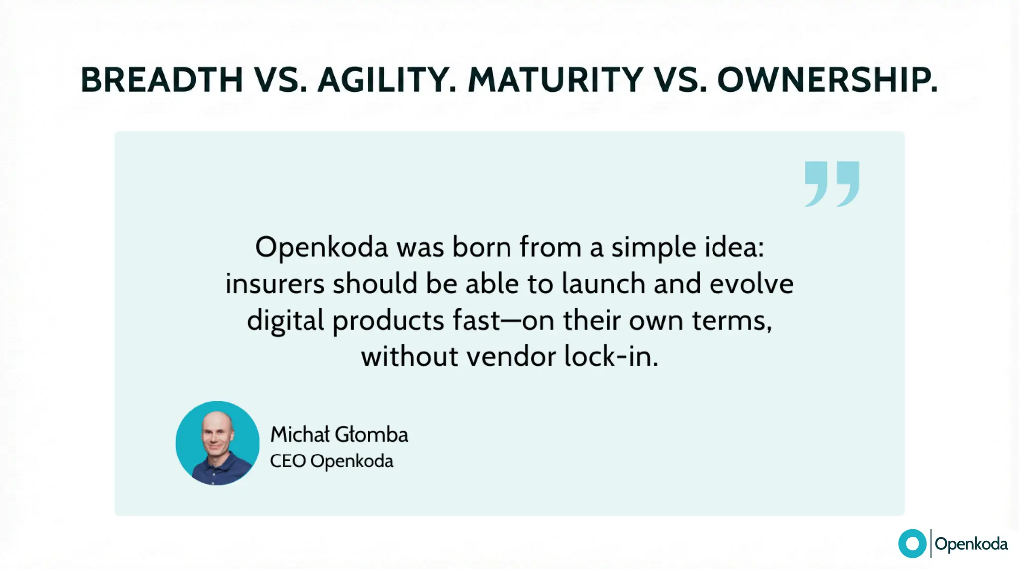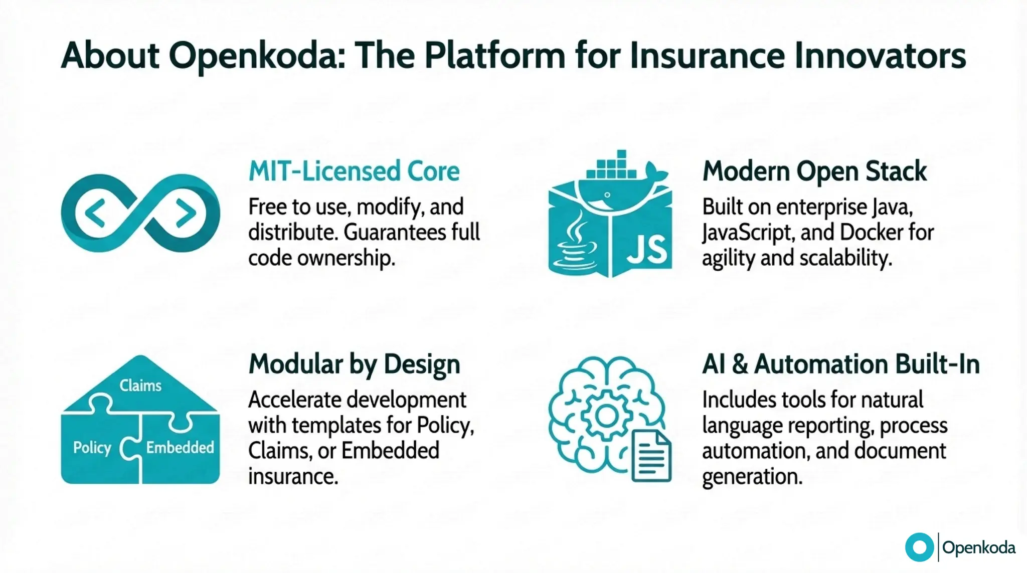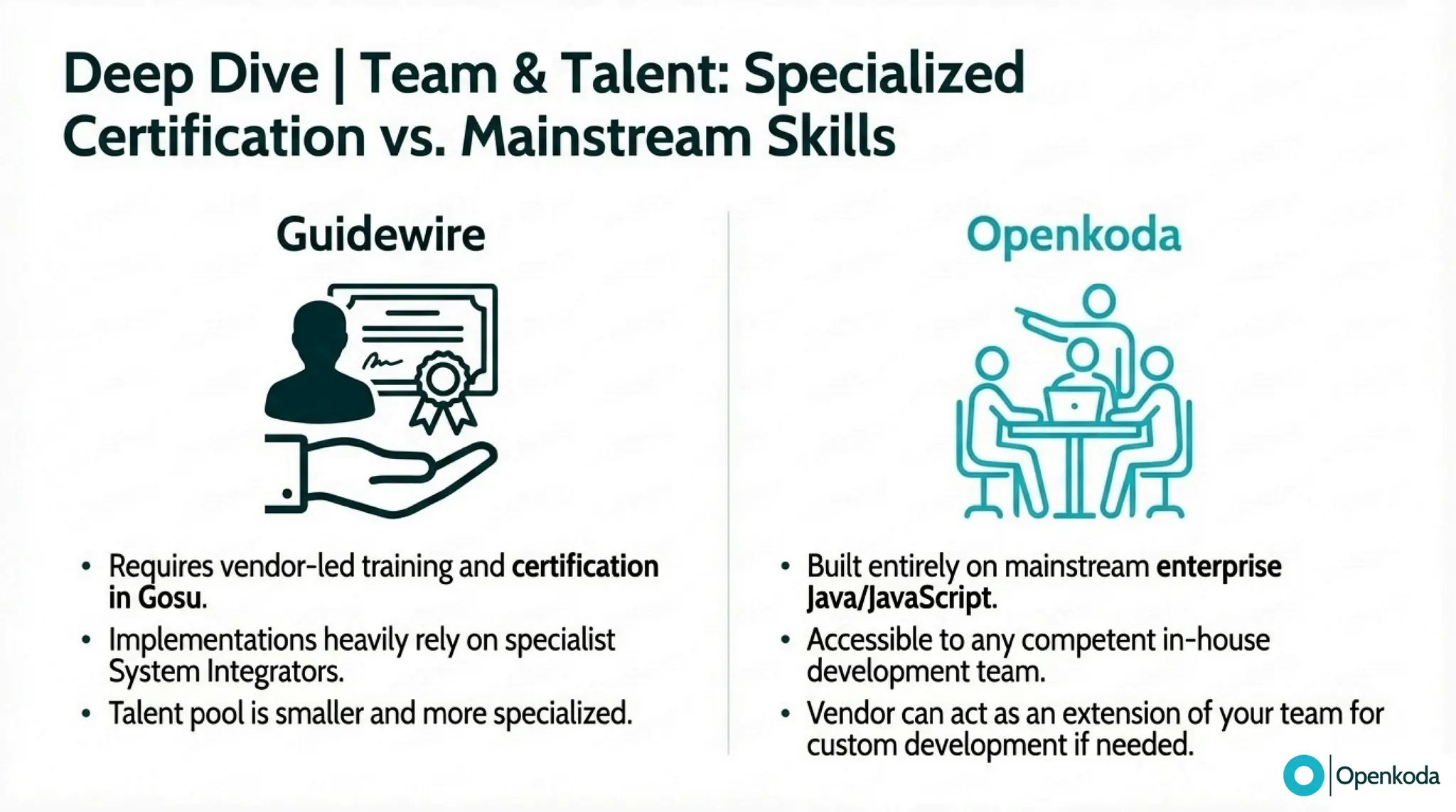 Break down the real trade-off between Guidewire’s integrated, proprietary suite and Openkoda’s open-source “canvas” for building exactly what your business needs. If you’re fed up with vendor lock-in, proprietary tooling (and the cost/complexity that comes with it), and a vendor-managed roadmap that makes every change feel heavier than it should, discover a more refreshing alternative built on open standards. See how Openkoda gives you full code ownership, cloud-agnostic deployment, API-first integration, and modular insurance building blocks - so you can modernize faster and evolve on your terms.