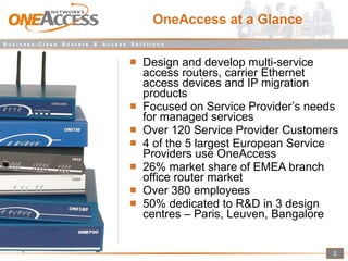 OneAccess is a company focused on developing multi-service access routers, carrier Ethernet access devices, and IP migration products for service providers. It has over 120 service provider customers, including 4 of the 5 largest European providers, and holds a 26% market share of the EMEA branch office router market. The company has 380 employees, with 50% dedicated to R&D across its 3 design centers in Paris, Leuven, and Bangalore.