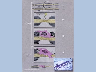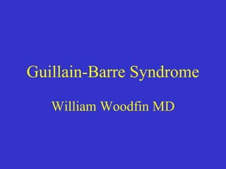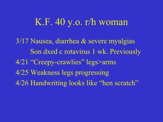This document describes a case of Guillain-Barré syndrome (GBS) in a 40-year-old woman. She developed nausea, diarrhea, and muscle aches after her son was diagnosed with rotavirus. Later she experienced numbness and tingling in her legs that progressed to weakness. Testing showed findings consistent with GBS including abnormal electromyography and absent reflexes. She was treated with intravenous immunoglobulin, showed some improvement, and was discharged.