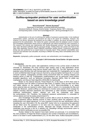 This document discusses the implementation of the Guillou-Quisquater protocol for user authentication utilizing zero knowledge proof to enhance security against password sniffing and database hacks. The study analyzes potential vulnerabilities through penetration testing based on OWASP standards, noting several risks identified, including error message exposures and credential transmission methods. This research highlights the effectiveness of zero knowledge proof, ensuring that user passwords are never sent in a manner that exposes sensitive data.