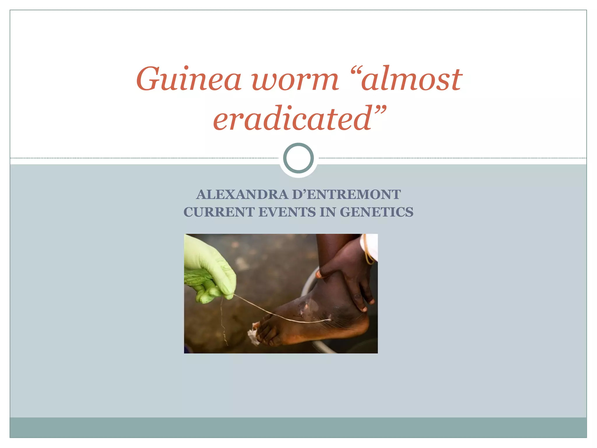 Guinea worm disease is close to being eradicated for the second time in history. Currently, the majority of cases are located in Sudan, with 4,410 reported so far this year. The Guinea worm enters through water contaminated with water fleas infected with Guinea worm larvae. There is no cure, but the meter-long worm is slowly removed by winding it around a stick over several weeks or months until it is fully extracted.