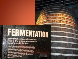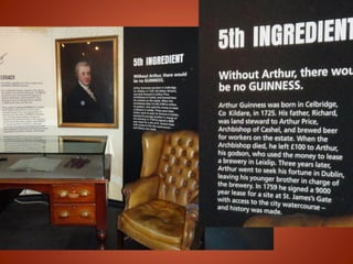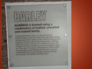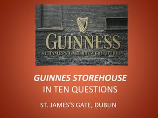 The document discusses 10 questions about Guinness beer and the Guinness Storehouse in Dublin. It outlines the 4 main ingredients of Guinness as malted barley, hops, yeast, and water. It also notes that Guinness uses about 2 million tons of malted barley from Ireland each year, enough to fill the Guinness Storehouse several times over. Finally, it briefly touches on the founding of the Guinness brewery at St. James's Gate and explains the basic brewing process.
