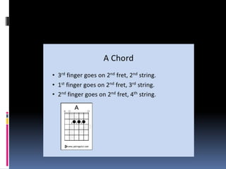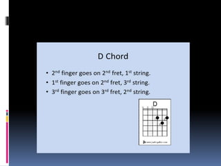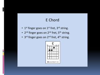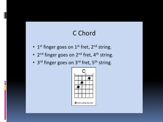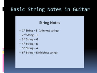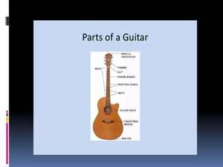 The document discusses basic guitar functions including that acoustic guitars have 6 strings with 4 thick strings and 2 thin strings. It also mentions finger positions and chords for beginners. Finger exercises are recommended to practice.