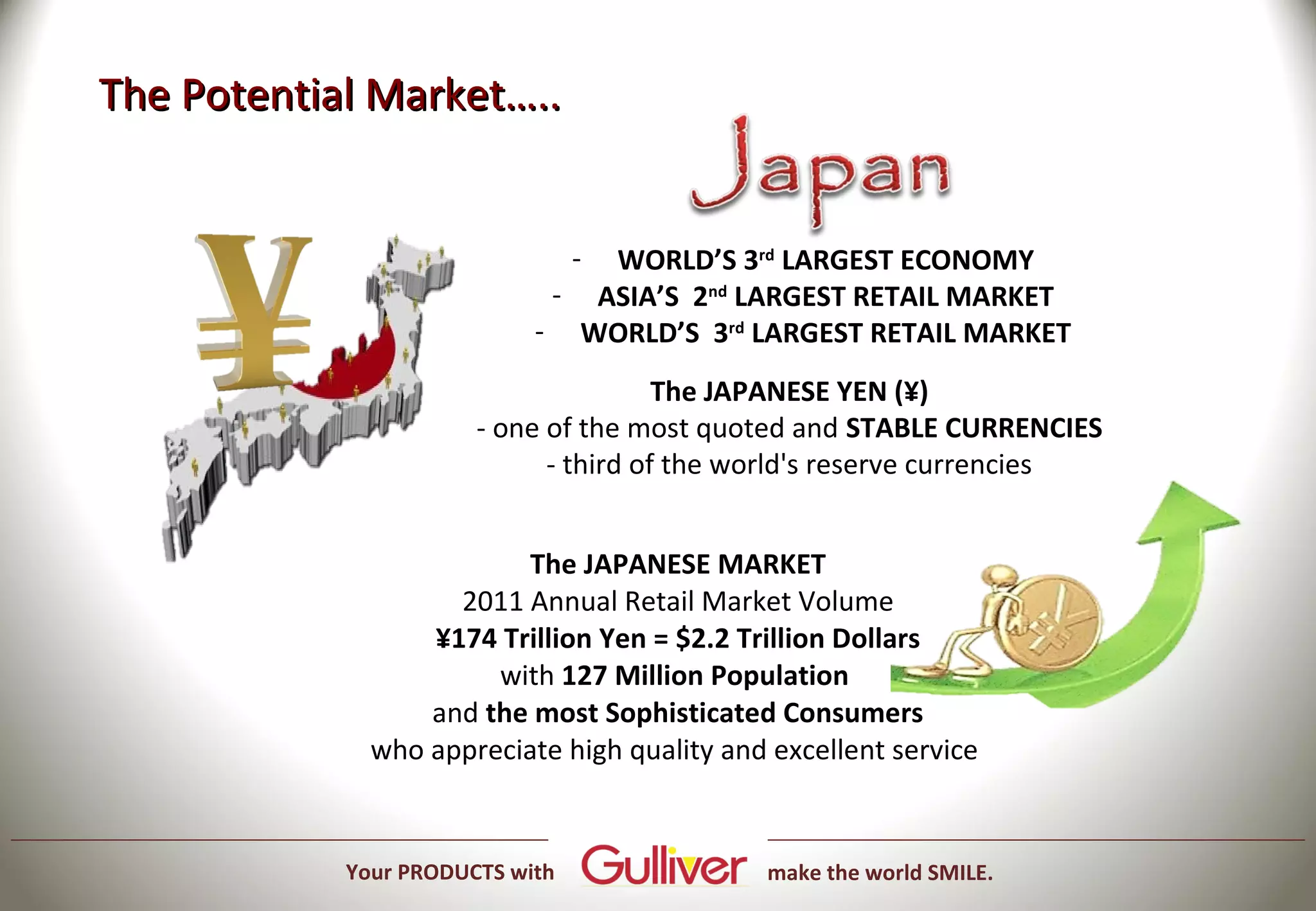 This document outlines opportunities for expanding business into the Japanese market through a partnership with Gulliver Integrated Outsourcing. Key points include: