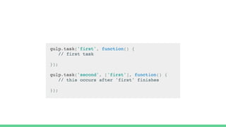 Gulp and webpack are development tools that can automate front-end tasks like compiling Sass to CSS, minifying files, and more. Gulp is powerful and supports asynchronous tasks via plugins. Webpack is suited for modular development, packaging code into bundles, and can be used with other tools. The key differences are that webpack bundles modules whereas gulp does not, webpack runs synchronously while gulp supports async tasks, and webpack handles assets like CSS and images in addition to JavaScript.