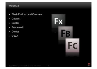 The document provides an overview of the Adobe Flash Platform user group tour, including demos of Flash Catalyst, Flash Builder 4, and the Flex 4 framework. Key points covered include new workflows for interaction and visual design in Catalyst, data-centric development features in Builder, and improvements to graphics, states, layout, and text in the Flex framework.