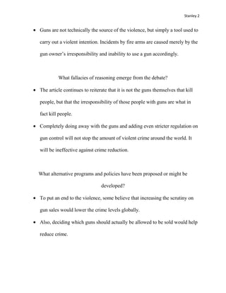The document discusses arguments around gun control legislation. Issues debated include the appropriate level of gun regulation and the effectiveness of laws in reducing crime. Supporters argue stricter laws could lower violence and accidental shootings. Opponents counter that statistics don't prove regulation reduces crime, and guns are simply tools, not the root cause of violence. Alternative policies proposed include increasing background checks and restricting certain firearms.