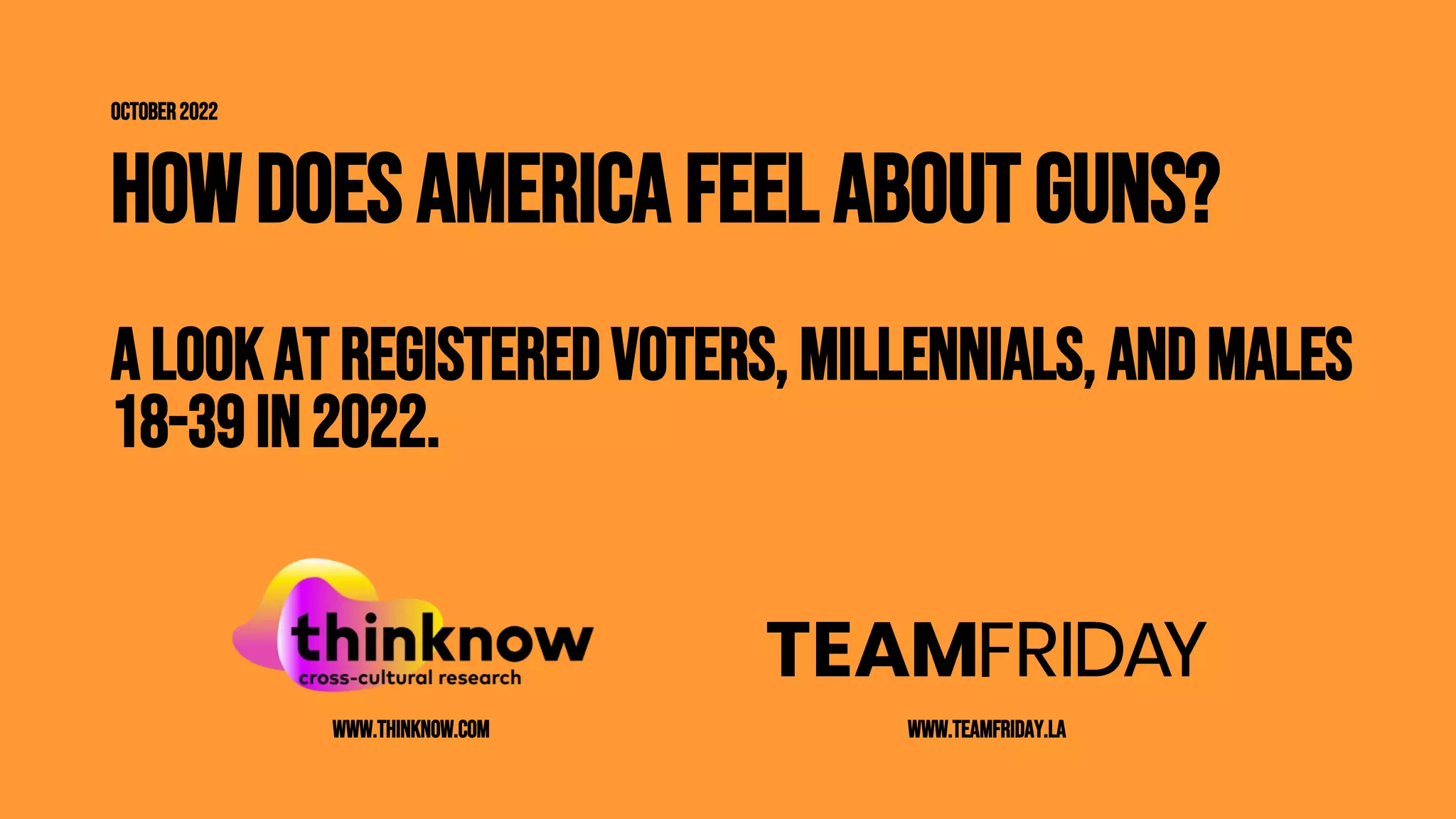 The document presents research conducted by TeamFriday and ThinkNow on American attitudes towards gun control, focusing specifically on registered voters, millennials, and males aged 18-39 as of 2022. Key findings include a growing support among registered voters for stricter gun laws, with significant backing from diverse demographic groups, and a notable change in sentiment among younger generations. The research emphasizes the importance of localized communication strategies to engage communities in the ongoing gun control debate.