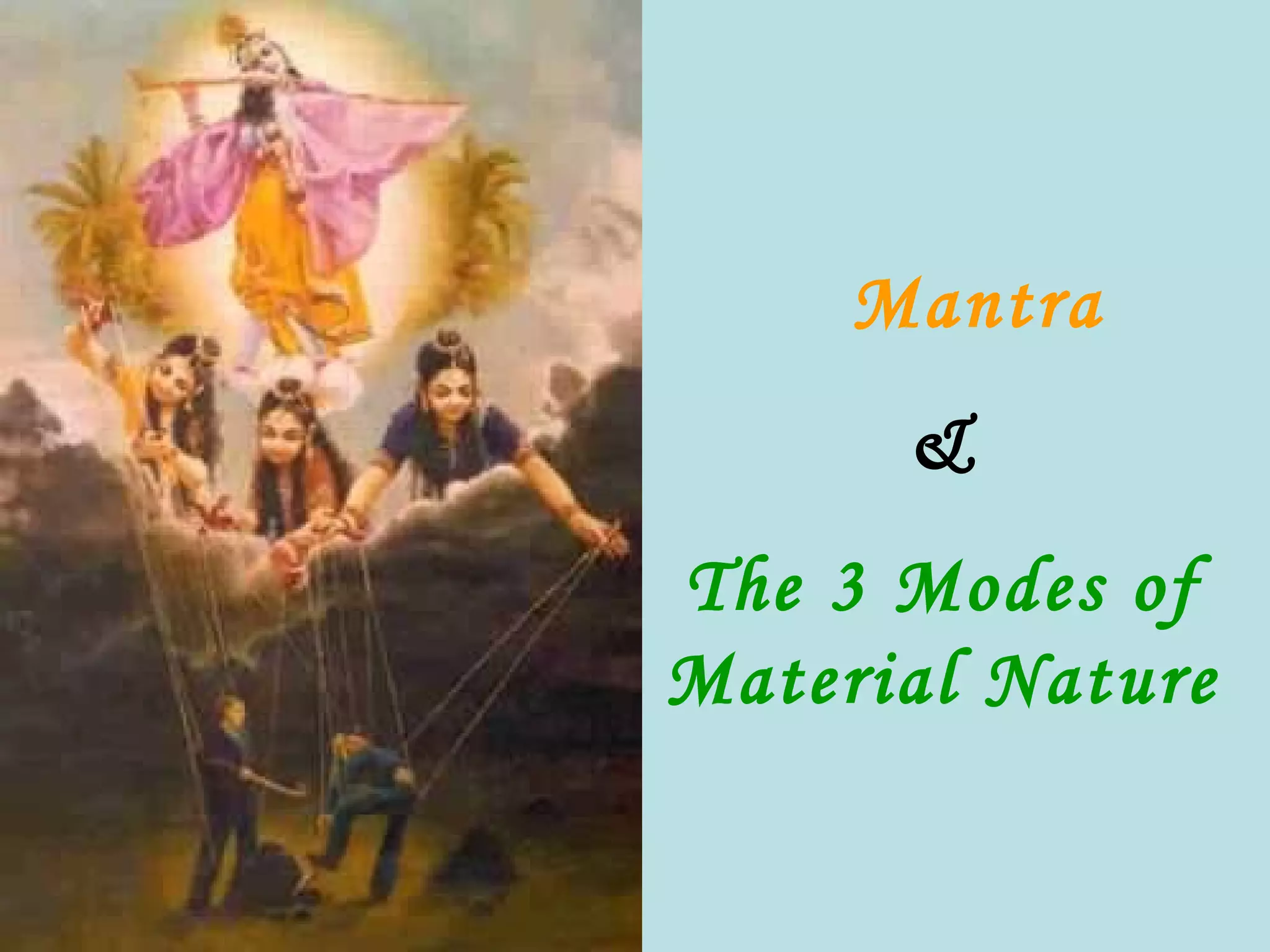The document discusses the three modes of material nature - goodness, passion and ignorance - and how they influence living entities. It states that the living entity thinks themselves the doer of activities due to being under the modes of material nature, but it is actually nature performing the actions. It also discusses how transcending the modes of material nature and achieving Krishna consciousness can free one from their influence.