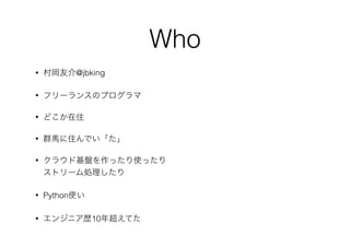 どこか在住 • 群馬に住んでい「た」 • クラウド基盤を作ったり使ったり ストリーム処理したり • Python使い • エンジニア歴10年超えてた