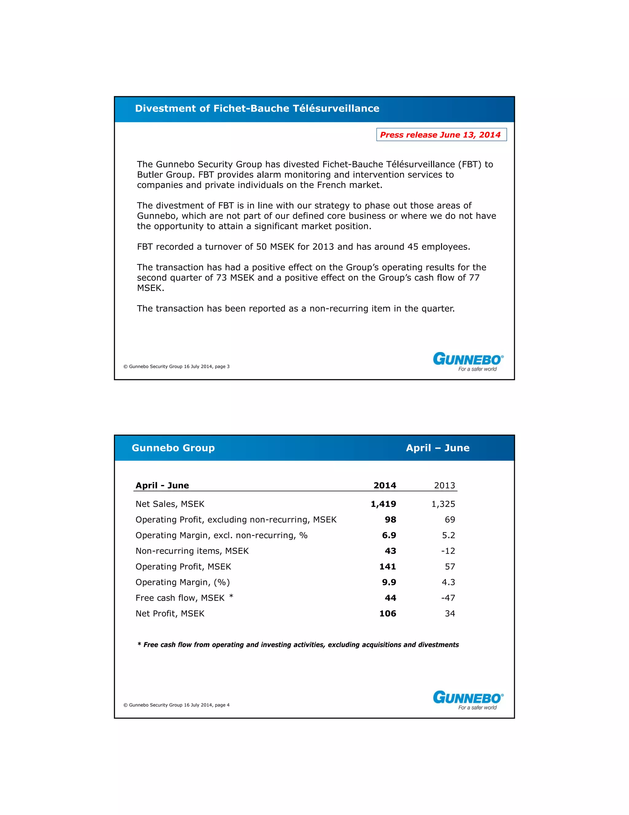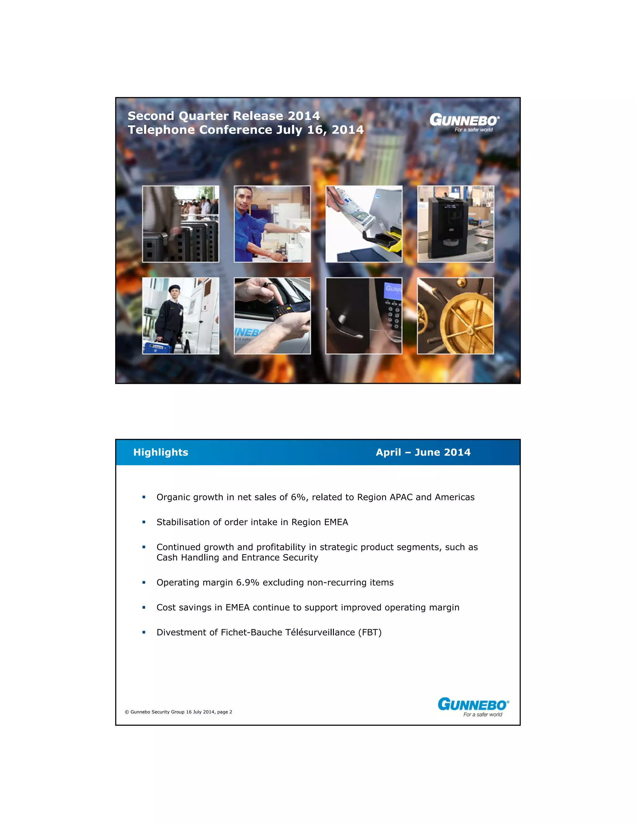 Gunnebo reported financial results for the second quarter of 2014. Net sales increased 6% organically driven by growth in the Americas and APAC regions. The operating margin was 6.9% excluding non-recurring items. Gunnebo divested its Fichet-Bauche Télésurveillance business and used the proceeds to reduce debt. For the full first half of 2014, net sales increased 5% organically while operating margin was 5.1% after excluding non-recurring items.