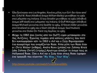 Όλα ξεκίνησαν στοLos Angeles. Κανένα μέλος των Gn'rδεν ήταν απο' κει. Ο Αxl W. Rose (Αληθινό όνομα William Βailey) γεννήθηκε το 1962 στο Lafayette της Indiana. Ο IzzyStradlinγεννήθηκε το 1962 (Αληθινό όνομα Jeff Isbell) στο Lafayette της Indiana. Ο Duff McKagan (Αληθινό όνομα Michael) γεννιέται στο Seattle το 1964. Ο Steven Adler γεννιέται στο Cleveland το 1965 και ο Slash (Αληθινό όνομα: Saul Hudson) γεννιέται στο Stoke-On-Trent της Αγγλίας το 1965. Μέχρι το 1982 όλοι (εκτός από τον Duff) είχαν μετακομίσει στο Λος Άντζελες. Έχοντας περάσει από κάποιες μπάντες που ποτέ δεν κυκλοφορήσαν κάτι το 1983 ο Axl και ο Izzy δημιούργησαν ένα συγκρότημα που ονομάζονταν Rose. Άλλα μέλη των Rose ήταν οι: Chris Weber (κιθάρα), Andre Roxx (μπάσο) και Johnny Kreis (aka Johnny Christ) (ντράμς).Αργότερα άλλαξαν το όνομα τους σε Hollywood Rose. Όσο ο Axl και ο Izzy ήταν στους Rose έγραψαν ένα τραγούδι που λέγονταν "My Way - Your Way". http://www.youtube.com/watch?v=nmkwvoiS6Kc
