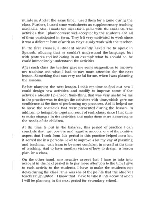 This document provides a final reflection from a student teacher on their primary school practice period teaching English. The practice took place at School No. 08, "Gral San Martin", which is one of the first schools in the region and was one of the first to have a classroom for students with special abilities. The student teacher taught 4th grade and focused on the topic of numbers. They designed activities using resources like posters, colored pencils, worksheets, and dice games. The activities engaged the students and improved the student teacher's confidence and lesson planning skills. However, they need to work on managing time better for each activity.