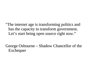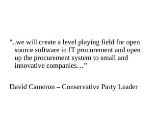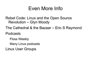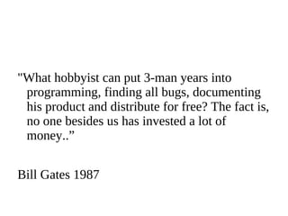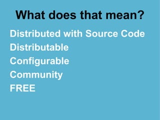 The document provides an introduction to open source software, detailing its benefits such as cost savings, flexibility, and community support. It covers the history of open source, major licenses, and its impact on various sectors including government and education. Additionally, it highlights the importance of open source in avoiding vendor lock-in and fostering innovation.