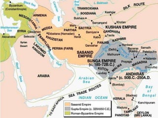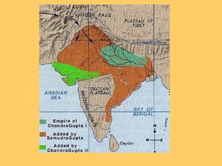 The Gupta Dynasty reunified much of northern India between 375-550 CE under a strong central government. Key rulers like Chandragupta I and Samudragupta expanded the territory through alliances and conquest. The Gupta Empire experienced a golden age of peace and prosperity, with advances in art, science, and mathematics. However, later extravagant Gupta rulers and invasions by the White Huns weakened the empire, leading it to break into independent kingdoms again.