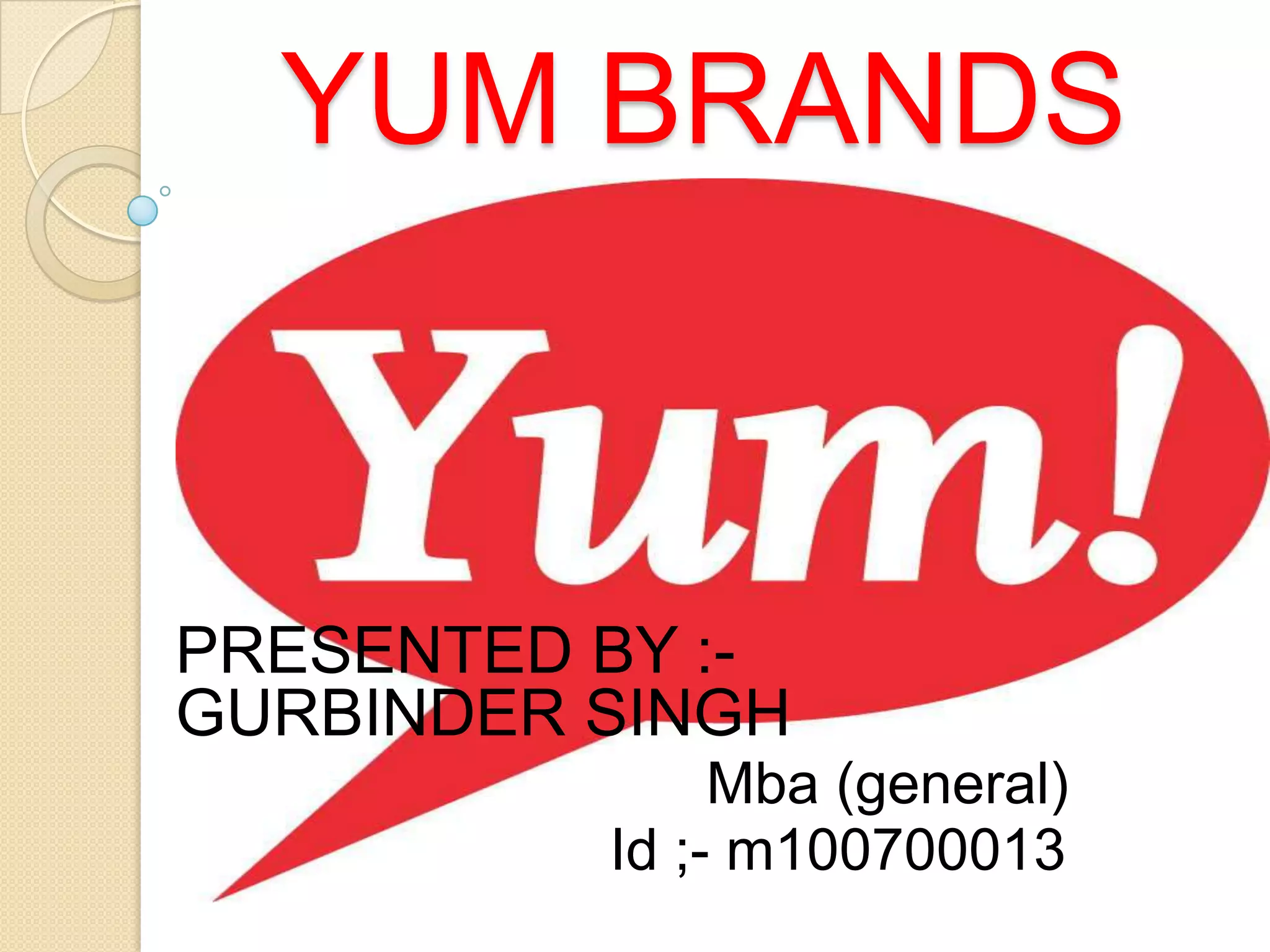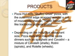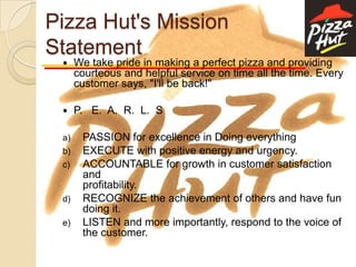 Yum Brands is the world's largest restaurant company with over 37,000 restaurants across 110+ countries. Headquartered in Louisville, Kentucky, Yum was created in 1997 as a spin-off from PepsiCo and owns KFC, Pizza Hut, Taco Bell, and Long John Silver's brands. Yum has over one million employees and annual revenue of $10.8 billion. Pizza Hut is one of Yum's major brands and is the world's largest pizza chain, selling stuffed crust and hand-tossed pizzas. Pizza Hut uses over 300 million pounds of cheese annually and had the first pizza delivery to space. Yum focuses on international growth and maintaining at least 10% annual EPS growth through