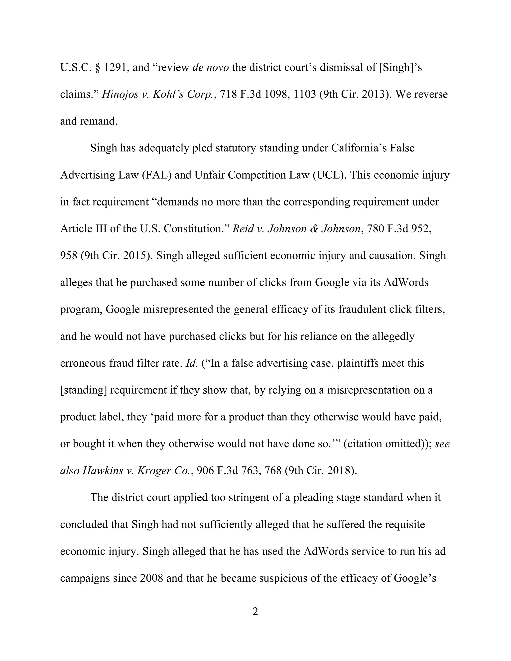 The Ninth Circuit reversed the district court's dismissal of Gurminder Singh's claims against Google LLC, concluding that Singh adequately alleged statutory standing under California's false advertising and unfair competition laws. The court found that Singh sufficiently demonstrated economic injury and causation related to his reliance on Google's misrepresentations about its ad filters. The case is remanded for further proceedings, as the district court applied an overly stringent standard in evaluating Singh's standing.