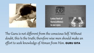 The document discusses the importance of finding an enlightened guru to guide one's spiritual journey. It states that without a guru's guidance, rituals and practices are meaningless and lasting peace of mind is difficult to attain. It emphasizes that the guru is equivalent to God and should be worshipped and never abandoned, as following the guru's teachings is the only path to self-realization and liberation. Disobeying or insulting the guru can lead to terrible consequences, so disciples should always obey and revere their guru.
