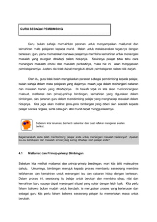 Dokumen ini membahas peran guru sebagai pembimbing dalam membantu pelajar menangani masalah hidup dan emosi, serta pentingnya bimbingan dalam pembelajaran. Guru perlu membina hubungan baik dan kemahiran mendengar aktif untuk memahami pelajar dan membantu mereka mengatasi cabaran. Bimbingan harus dilakukan secara kolaboratif dan mematuhi prinsip dan etika untuk memaksimalkan efek positif pada perkembangan pelajar.