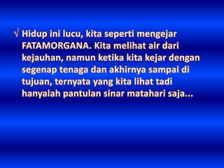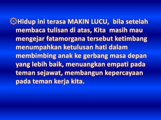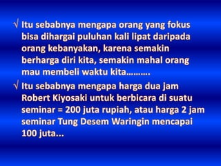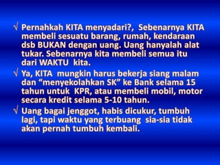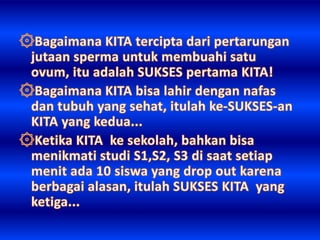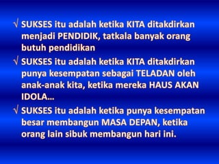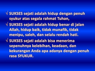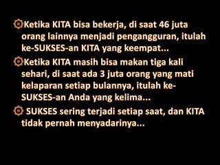Dokumen ini membahas arti sukses yang bervariasi, mencakup kekayaan, ketenaran, dan teladan dari berbagai tokoh. Sukses digambarkan sebagai tindakan yang harus dilakukan sekarang, karena waktu yang berlalu tidak akan kembali. Penekanan pada pentingnya hidup yang singkat mengajak pembaca untuk segera bertindak.