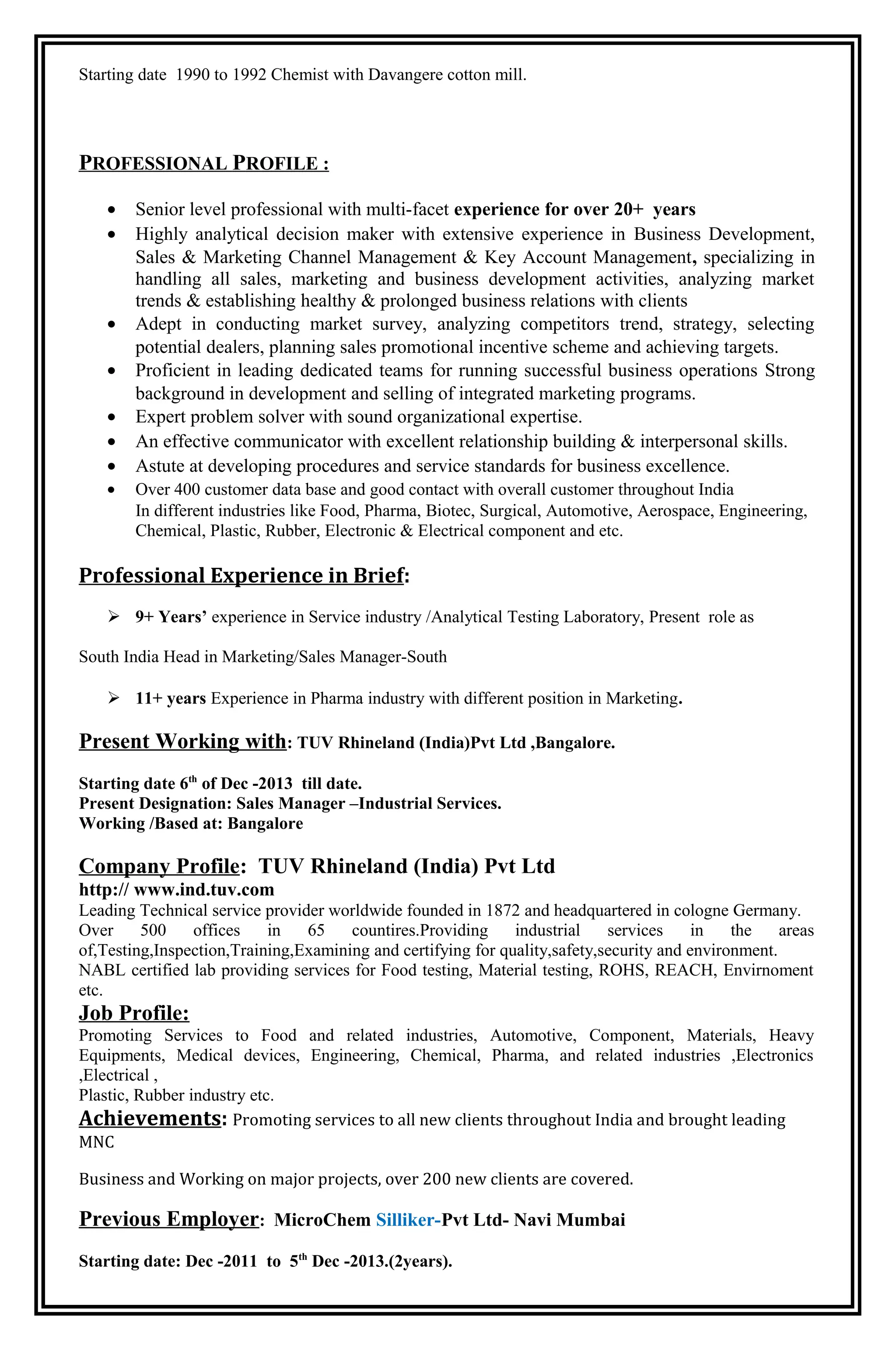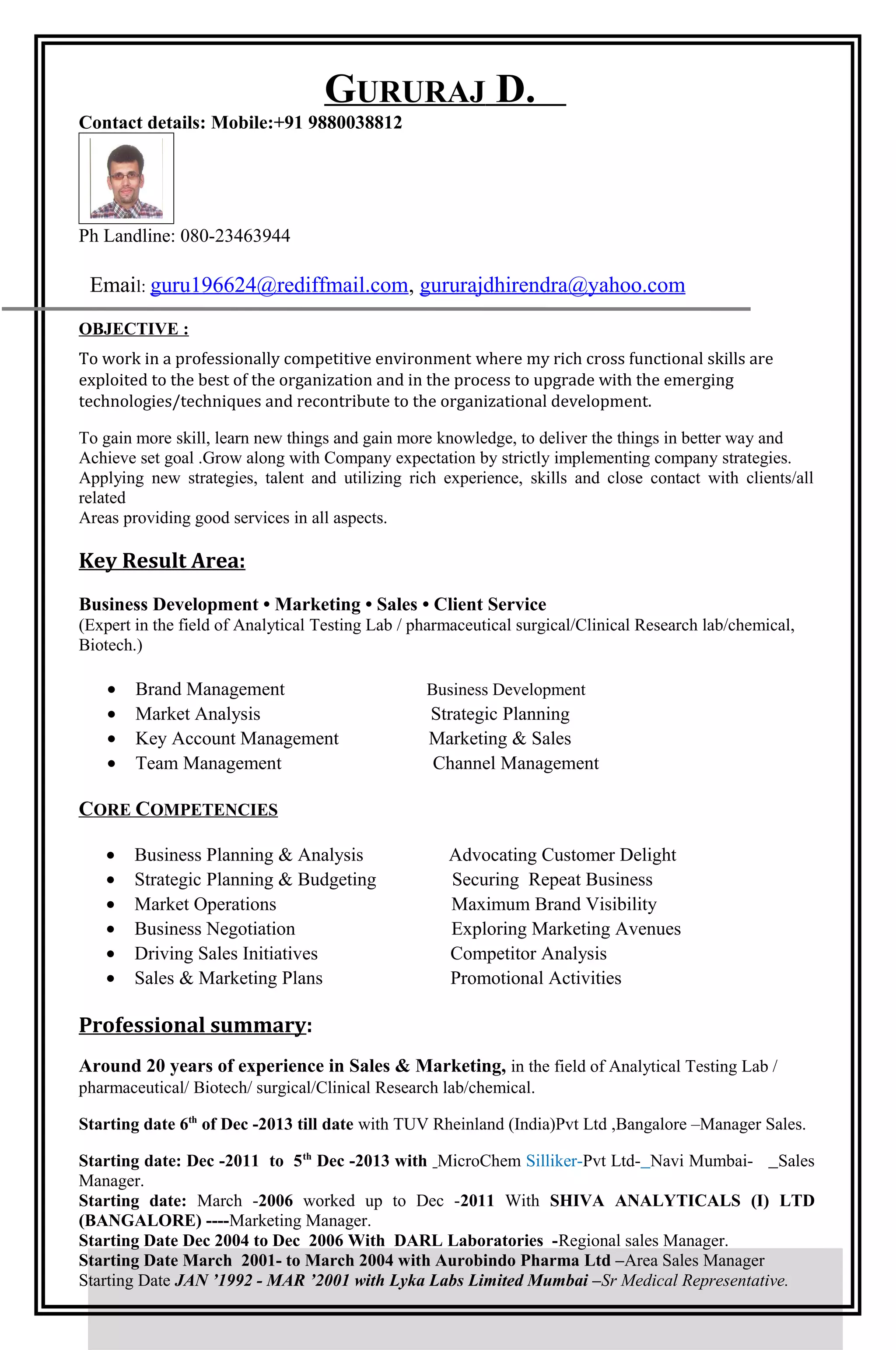 Gururaj D. has over 20 years of experience in sales and marketing in analytical testing labs, pharmaceuticals, biotech, and clinical research. He currently works as a Sales Manager for TUV Rheinland India, promoting testing services to various industries. Previously, he held marketing roles at MicroChem Silliker and Shiva Analyticals. Gururaj aims to work in a competitive environment where he can utilize his cross-functional skills and continue learning new technologies.