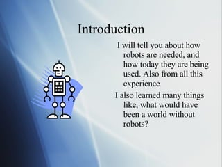 The document discusses how robots are increasingly being used in various areas such as factories, underwater exploration, and warfare. It notes that robots are needed for industrial manufacturing and are useful in the military for reconnaissance and protecting soldiers. The document also suggests that robots may someday assist with household chores and caretaking tasks. It concludes by emphasizing that technology and the use of robots is constantly advancing and changing how people live.