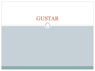 The document discusses the use of the verb "gustar" in Spanish. It explains that unlike in English, where you say "I like", in Spanish you say "Me gusta" or "Me gustan". This is because "gustar" means something is pleasing to you rather than directly meaning "like". It also discusses using "gusta" for singular nouns and "gustan" for plural nouns, and how to conjugate "gustar" for different subjects.