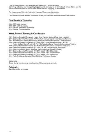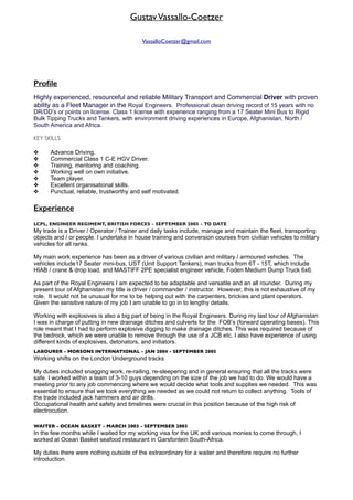 Gustav Vassallo-Coetzer is a highly experienced commercial driver and fleet manager with over 15 years of experience driving various civilian and military vehicles ranging from minibuses to trucks and tankers. He has worked for the British military as a driver, operator, and trainer since 2005, where his duties include transporting people and equipment and training other soldiers. He also has experience working as a laborer maintaining London Underground tracks, as a waiter, and as an armed protection officer transporting money.