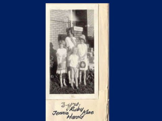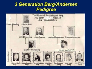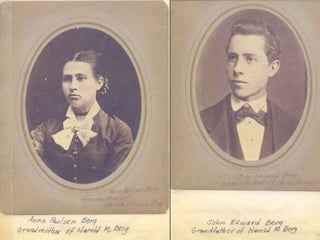 This document provides a biography of Gustave Edward Berg (1884-1968) compiled from family sources. It summarizes his Norwegian heritage, childhood in Logan, Utah where he lost a sister and had his father leave on a mission. As a young man, he apprenticed, was active in the church, and married Agnes Andersen in 1907. They had seven children and lived in several homes in Salt Lake City and Holladay, Utah. After Agnes' death in 1935, Gustave remarried and moved to Omaha, Nebraska where he worked for the Union Pacific Railroad and had two more children before settling in Bellevue, Nebraska.