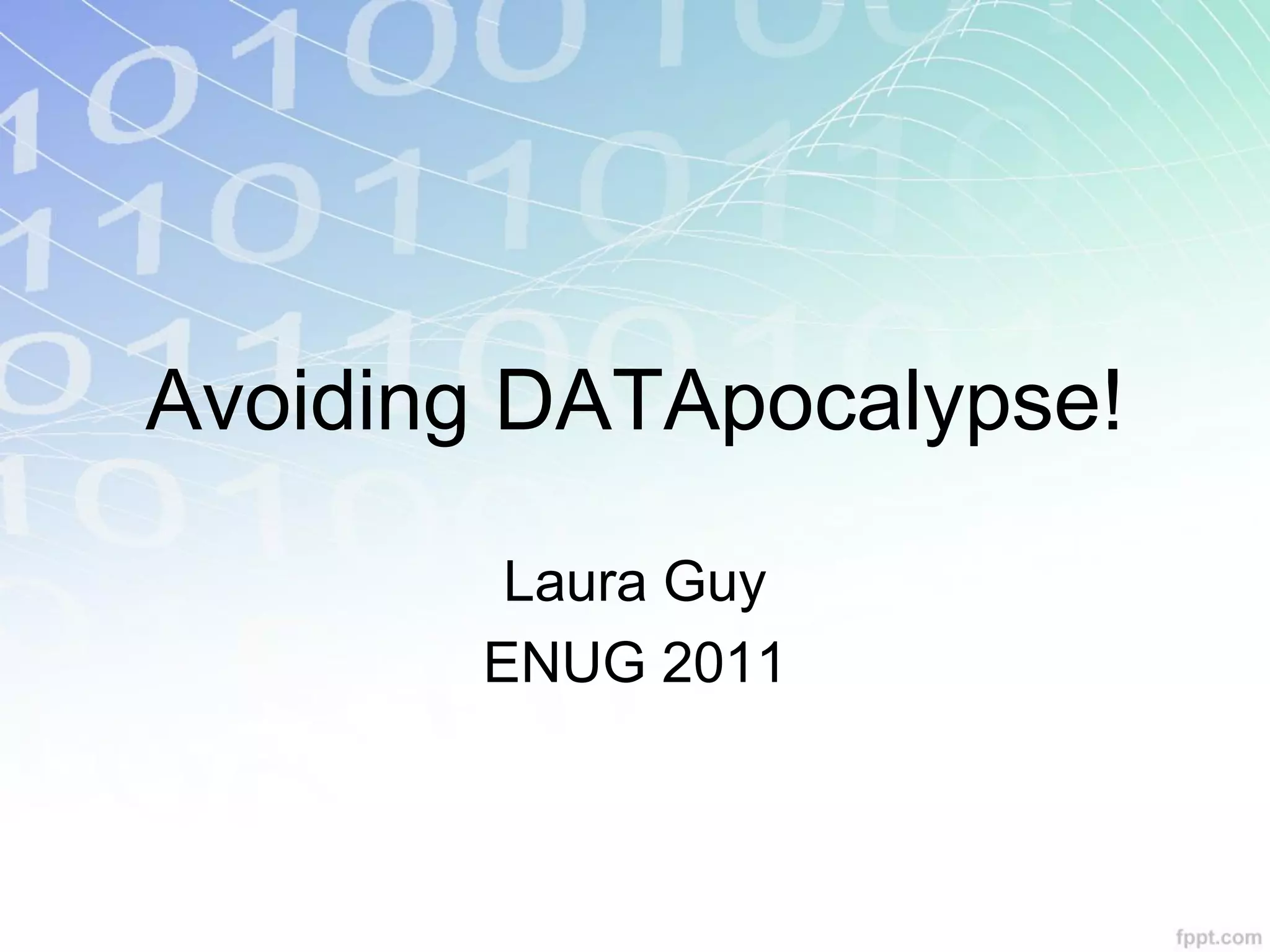 The document provides an overview of research data management and the importance of avoiding a "DATApocalypse" or data disaster. It discusses the definition of research data, why data management is important, questions to consider, best practices for data management planning, documentation, and long-term preservation. The goal is to help researchers and institutions properly manage data to enable sharing and preservation, as required by most major funders.