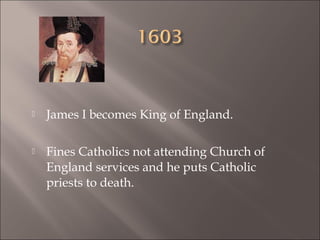 1) In 1605, a group of Catholic conspirators led by Robert Catesby hatched a plan to blow up the English Parliament with gunpowder on November 5th, when the State Opening was scheduled. 2) The plotters rented a house near Parliament and began tunneling, but hit groundwater. They were eventually able to store 36 barrels of gunpowder in a cellar. 3) One of the plotters, Guy Fawkes, was left in charge of guarding the gunpowder but they were discovered when authorities searched the cellar after an anonymous warning letter.