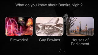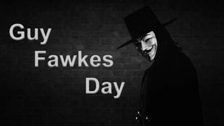 The document summarizes the Gunpowder Plot of 1605, in which a group of Catholic conspirators led by Robert Catesby plotted to blow up the Houses of Parliament in London. Guy Fawkes was placed in charge of storing and lighting the gunpowder in a cellar beneath the building. However, the plot was foiled when an anonymous letter warned Lord Monteagle not to attend Parliament, leading to a search that discovered Fawkes and the gunpowder. Fawkes and the other plotters were arrested, tried, and sentenced to the gruesome punishment of being hanged, drawn and quartered. Their failure is commemorated annually in Britain on Guy Fawkes Night with fireworks