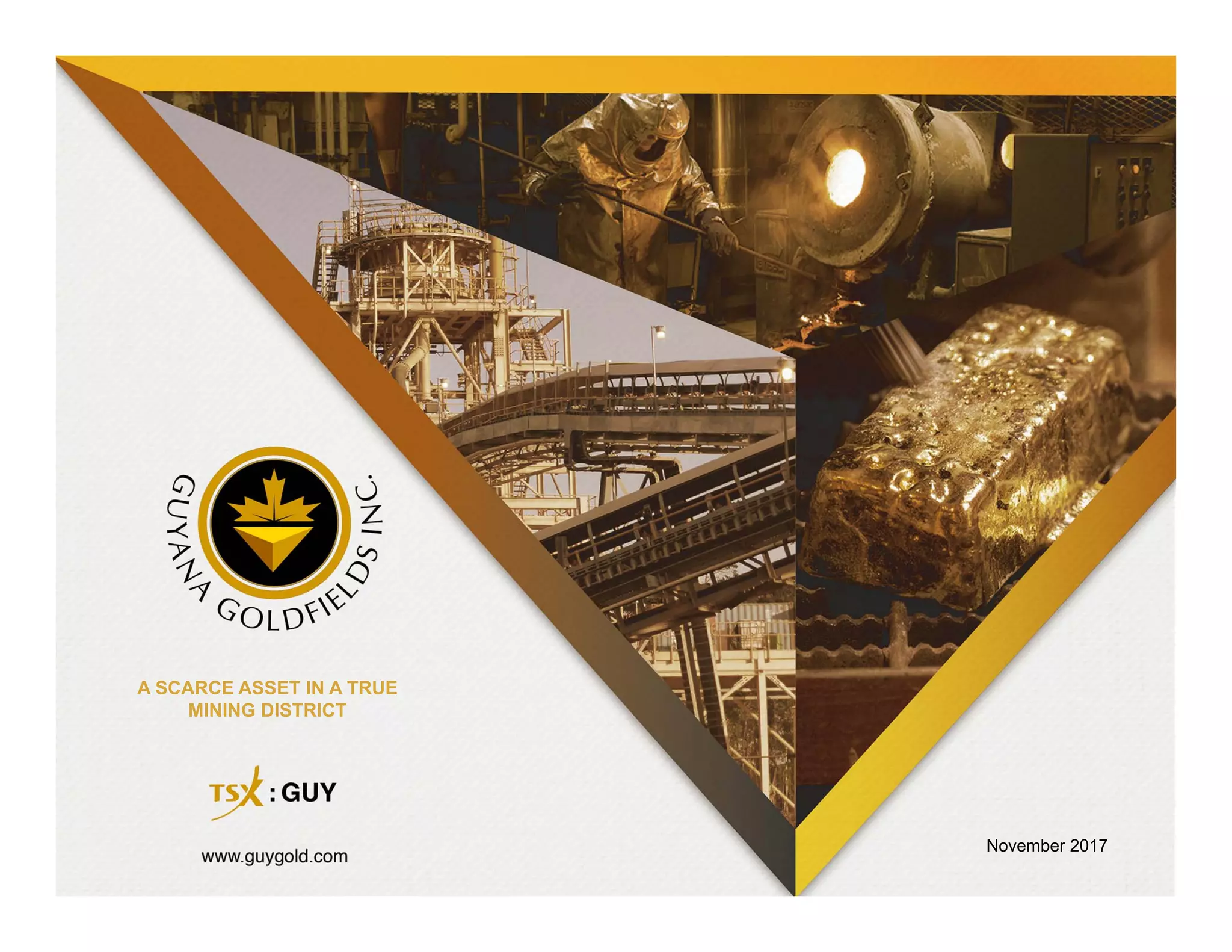 The document discusses Guyana Goldfields Inc., an operating gold mine in Guyana. It provides an overview of the Aurora Gold Mine, including production metrics and costs, and highlights exploration targets near the mine and elsewhere in the company's large land package that could provide future production growth. The company aims to increase reserves and resources through exploration drilling at existing deposits and recently identified prospects in order to extend the mine life beyond 15 years.