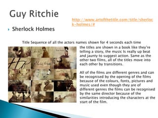 Guy Ritchie is a British film director known for films like Sherlock Holmes, Rock n Rolla, and Snatch. He became interested in filmmaking after seeing Butch Cassidy and the Sundance Kid as a child. The openings of his films have similar stylistic elements - the credits transition smoothly into one another with upbeat music, they are presented in a graphic novel-like style to set the tone, and they introduce the characters against backdrops relating to the films' London-based crime stories. These opening credit sequences help establish Ritchie's signature style and prepare viewers for the genres of the films to come.
