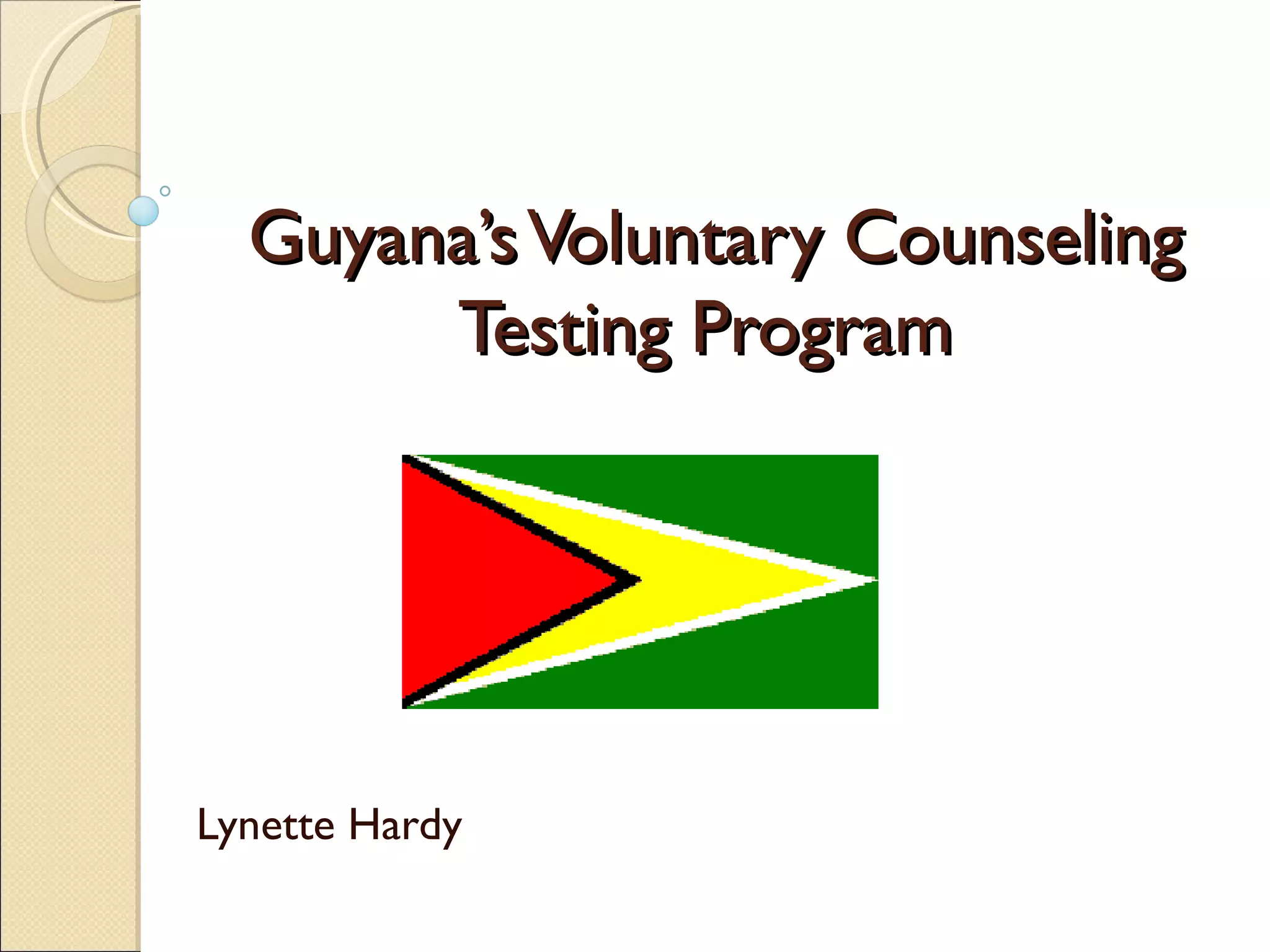 Guyana's Voluntary Counseling and Testing (VCT) program provides standardized training to counselors and testers, operates VCT outlets to provide counseling and testing services, and has referral systems in place. It conducts key awareness and testing activities including quarterly feedback meetings, Valentine's Day promotions for couples, a National Week of Testing, and events on World AIDS Day. The VCT program faces ongoing challenges and seeks to implement recommendations to improve quality of services.