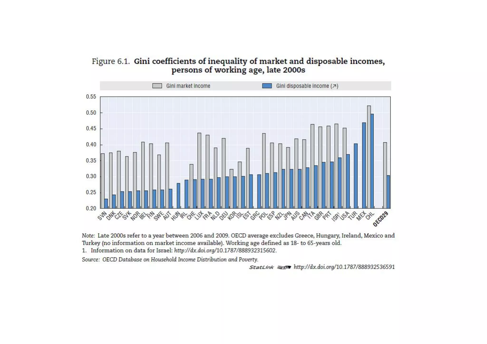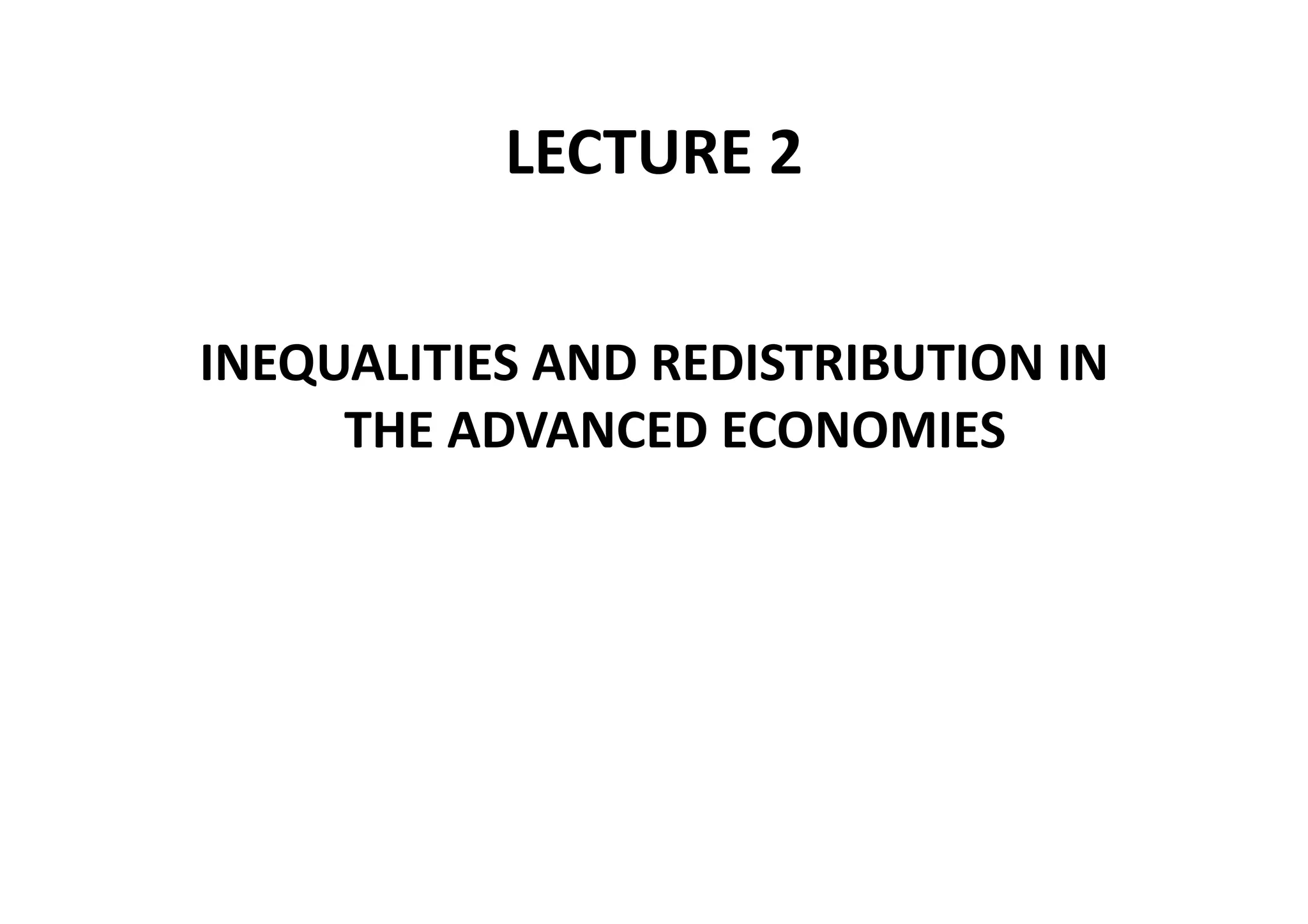 This document discusses measuring inequality and redistribution across advanced economies. It begins by explaining how inequality is typically measured using the Gini coefficient, with higher scores indicating higher inequality. Graphs show Gini coefficient scores for OECD countries in the mid-2000s, with the US and UK having among the highest inequality. The document also examines inequality within countries using income deciles and discusses factors that can influence inequality levels between nations, such as the strength of organized labor, economic openness, and welfare institutions.