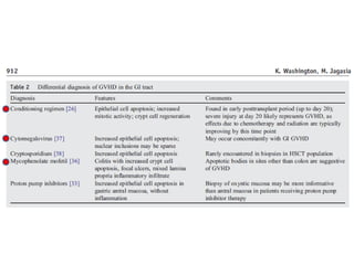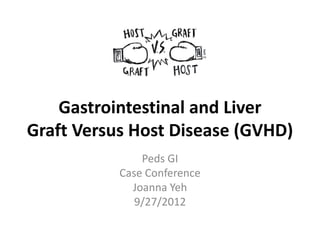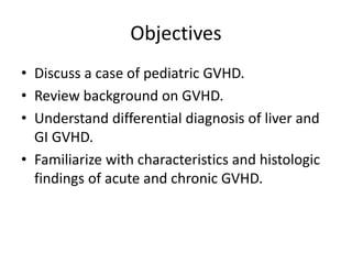 This document discusses gastrointestinal and liver graft versus host disease (GVHD) in pediatric patients. It begins with an overview of GVHD, including definitions, pathogenesis, risk factors, symptoms, grading scales, and differential diagnoses for liver and GI involvement. The case presentation describes a 22 month old boy with skin and GI GVHD following a bone marrow transplant. Endoscopy findings and biopsy results are discussed which supported a diagnosis of colonic GVHD. Histologic characteristics of acute and chronic GI and liver GVHD are reviewed. Optimal biopsy sites and challenges in diagnosis are also covered.