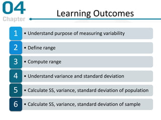 Chapter 4 focuses on measures of variability, specifically range, variance, and standard deviation, explaining their importance in statistical analysis. It details methods for calculating these measures for both populations and samples, highlighting the differences and implications of biased versus unbiased statistics. Additionally, the chapter discusses the relevance of variability in interpreting data distributions and making inferences about populations.