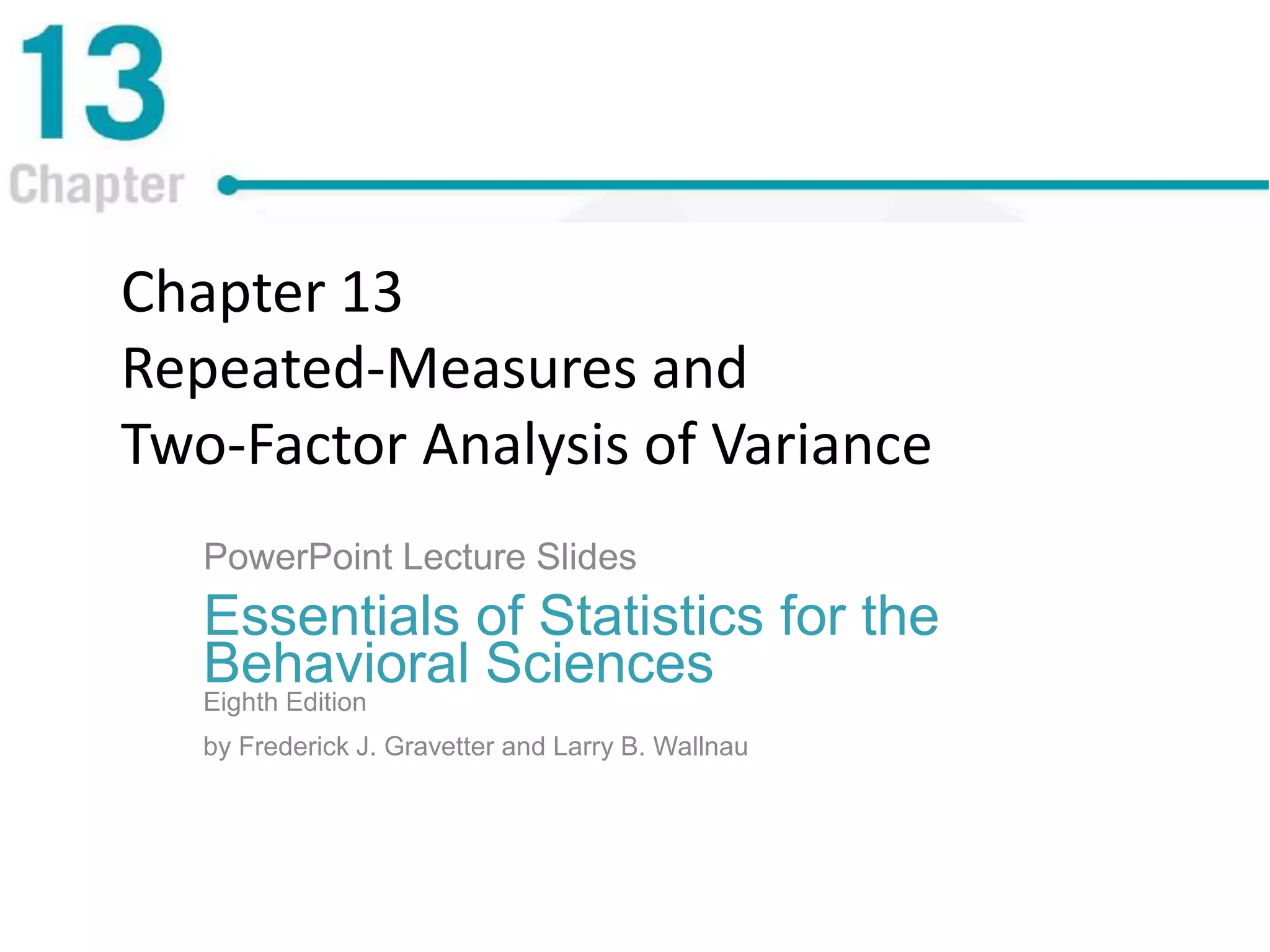 Chapter 13 discusses repeated-measures and two-factor analysis of variance in statistics, highlighting learning outcomes such as understanding ANOVA designs and calculating various statistical measures. It explains the methodology for repeated-measures ANOVA, including its hypotheses, structure, and the benefits of controlling for individual differences among participants. Additionally, it presents the two-factor ANOVA approach, emphasizing main effects, interactions, and the importance of testing assumptions for valid statistical conclusions.