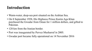 Gwadar port is a deep-sea port located in Baluchistan, Pakistan along the Arabian Sea. It was purchased by Pakistan in 1958 and has since undergone development to become a major commercial port. Gwadar port is strategically important as it is located near key shipping lanes and countries with major oil reserves. Its development is planned in two phases and aims to boost Pakistan's economy by improving trade, transportation, infrastructure and job opportunities when complete. The port development also aims to improve conditions in Baluchistan.