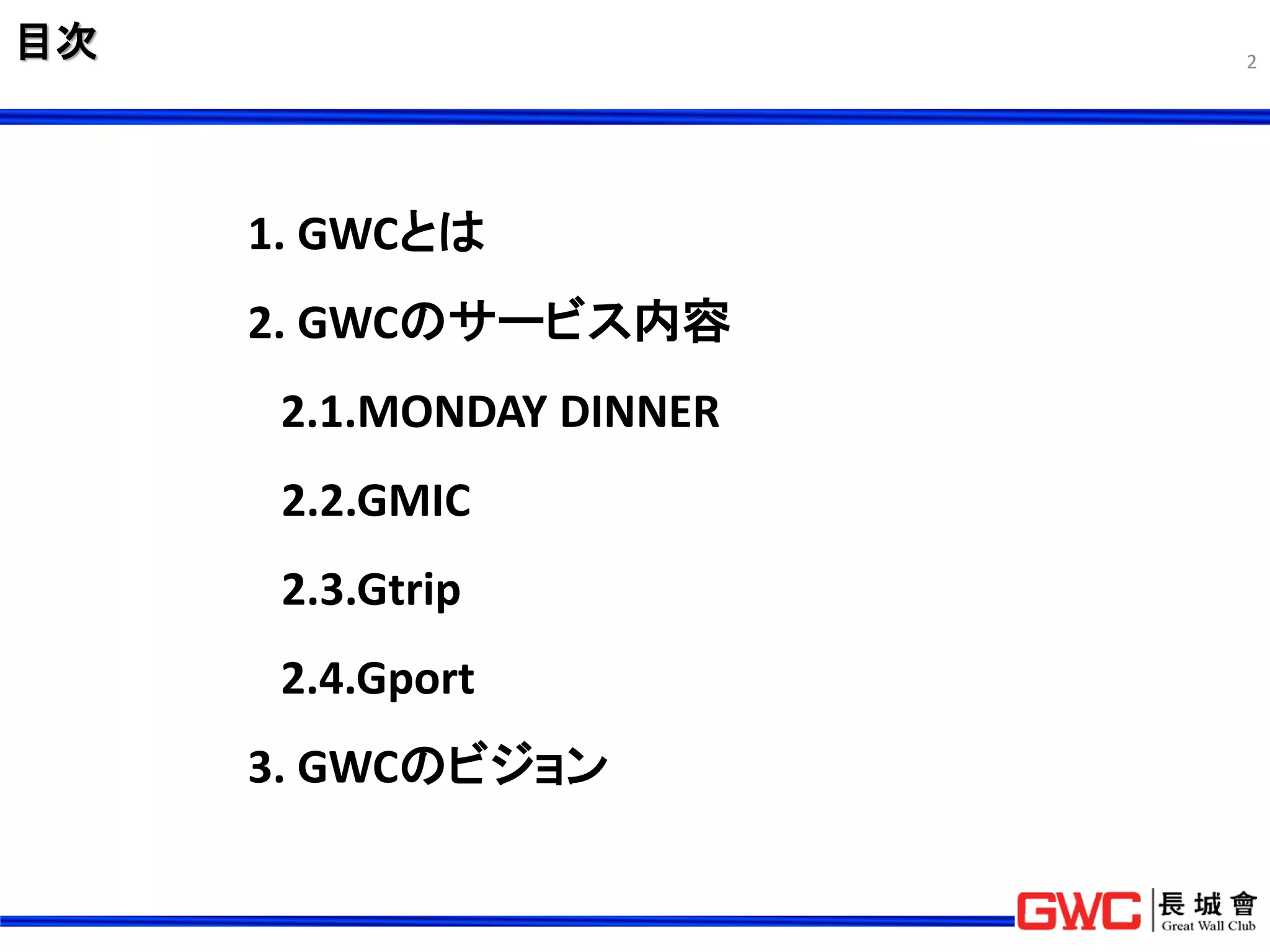 2 1. GWCとは 2. GWCのサービス内容 2.1.MONDAY DINNER 2.2.GMIC 2.3.Gtrip 2.4.Gport 3. GWCのビジョン